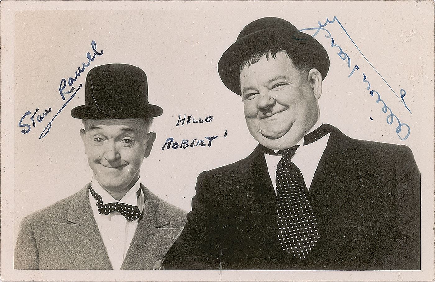 Vintage glossy 5.5 x 3.5 photo of the comedy duo side-by-side in their iconic bowler hats, signed and inscribed in fountain pen, "Hello Robert! Stan Laurel" and "Oliver Hardy.” In fine condition, with a few light creases.