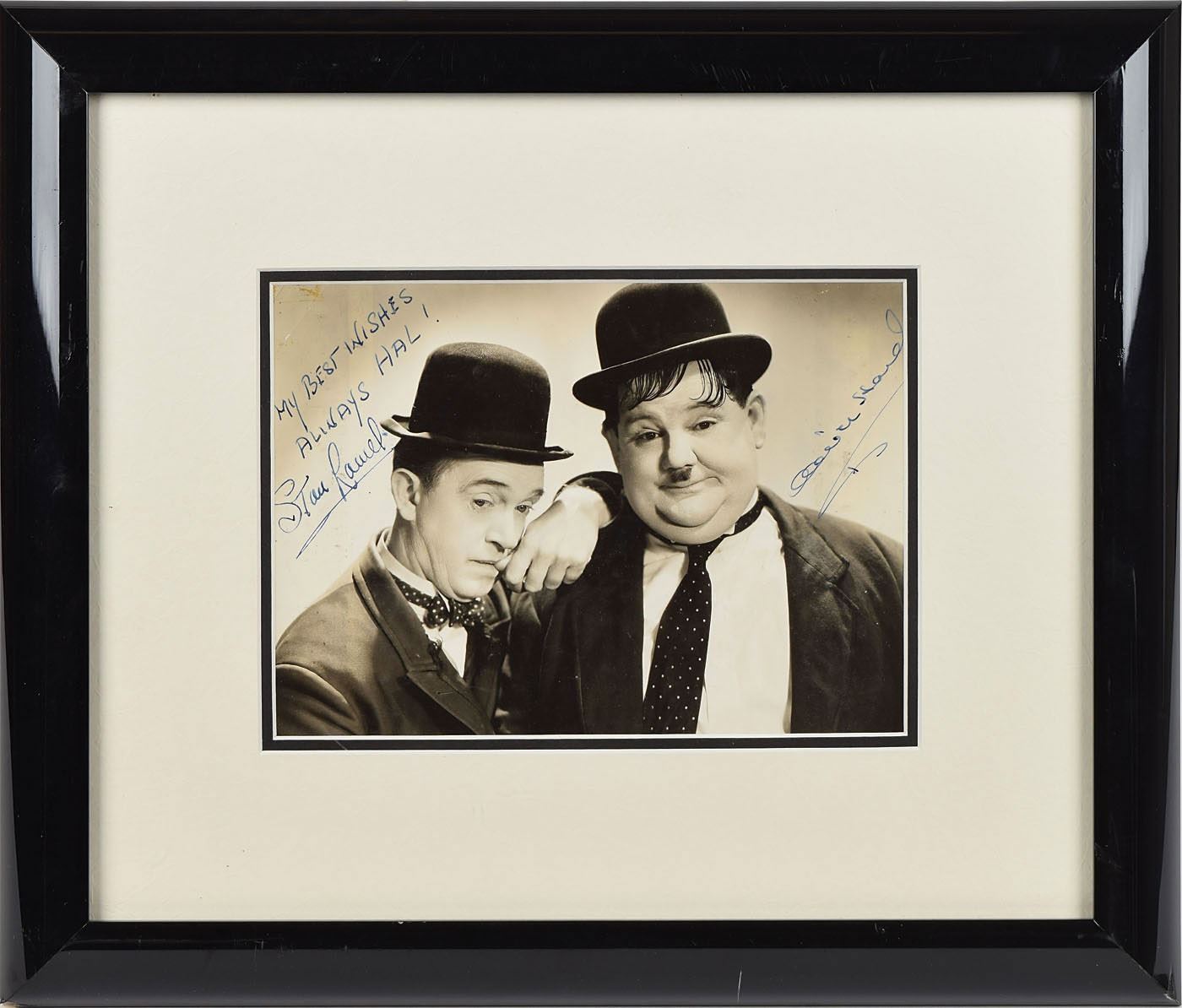 Classic vintage glossy 9 x 6.25 photo of the comedic duo side-by-side in their bowler hats, signed and inscribed in fountain pen, "My Best Wishes Always Hal! Stan Laurel" and "Oliver Hardy.” Double-matted and framed to an overall size of 16.75 x 14.25. In very good to fine condition, with light scuffing and creasing, primarily to the corners.