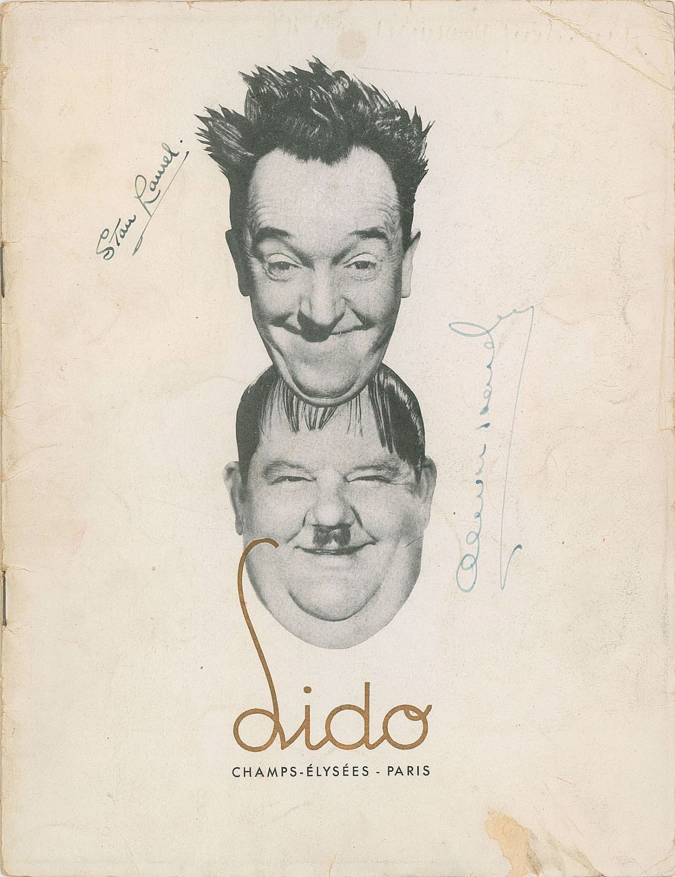 Vintage circa 1947 French program for a Laurel and Hardy performance at Le Lido cabaret on the Champs-Élysées in Paris, 14 pages, 8.5 x 11, signed on the appealing front cover in fountain pen by the comedic duo. Collector's notations to inside of front cover date the signatures to November 20, 1947. In very good condition, with scattered light creasing, soiling, light staining, and an area of surface loss to the bottom edge.
