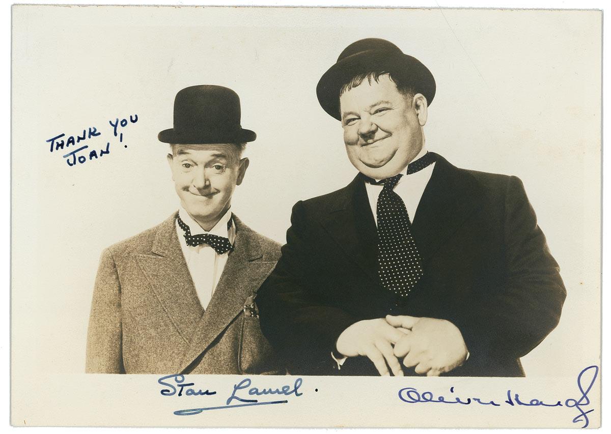 Charming vintage matte-finish 7 x 5 photo of the pair wearing bowler hats and sporting playful grins, signed and inscribed in fountain pen “Thank you Joan! Stan Laurel,” and “Oliver Hardy.” In fine condition, with some scattered light silvering to darker areas of image. Accompanied by the original Laurel and Hardy Feature Productions mailing envelope.