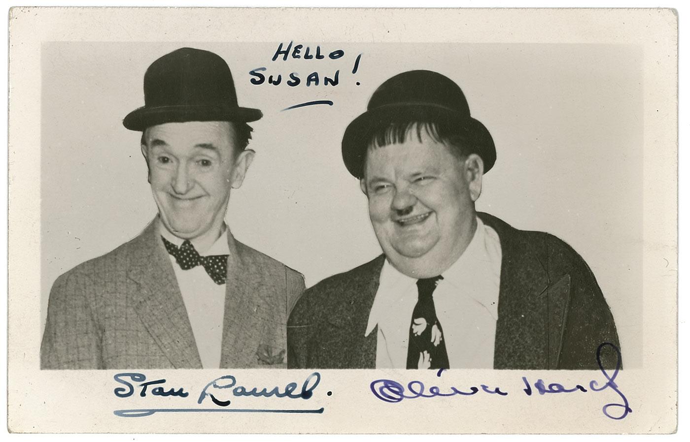 Vintage 5.5 x 3.5 postcard photo of the pair in their bowler hats, signed and inscribed in fountain pen “Hello Susan! Stan Laurel” and “Oliver Hardy.” In fine condition, with scattered light surface marks and dings.