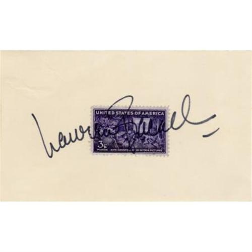 <B>Lauren Bacall Autograph.</B></I> A 5" x 3" card, with a three-cent commemorative postage stamp affixed, signed by the celebrated actress in black ink. Bacall's signature extends across the face of the stamp and is large and clean. In Excellent condition.<BR><BR><b>Shipping:</b> Flat Material, Small (<a target="_blank" href="http://www.heritageauctions.com/common/shipping.php">view shipping information</a>)
