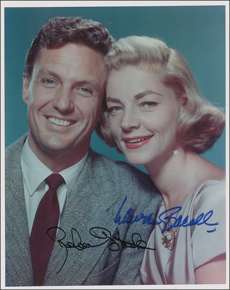 Color glossy 8 x 10 photo of Bacall and Stack posing together, signed in blue felt tip by Lauren Bacall and in black felt tip by Robert Stack. In fine condition.