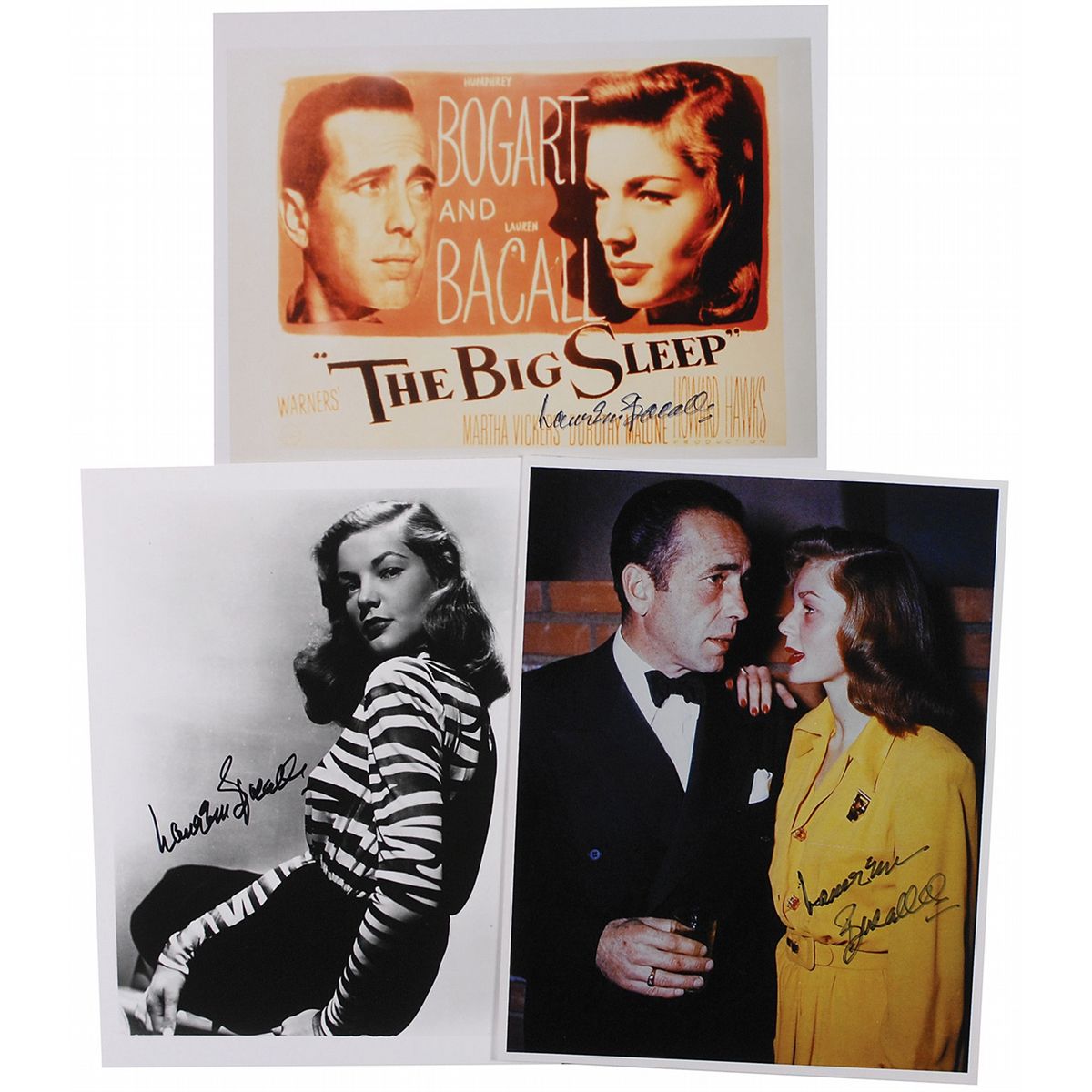 Three glossy photos, two 8 x 10 and one 10 x 8, including two color, each signed in black felt tip by Bacall. In fine condition.