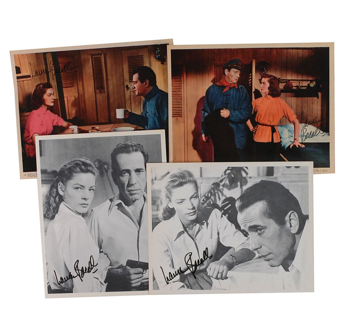 Four signed photos: two original color glossy 10 x 8 Warner Bros. promotional photos for Blood Alley showing the actress with John Wayne, each signed in black felt tip by Bacall; and two cardstock photos of her with Humphrey Bogart, 8 x 10 and 10 x 8, each signed in black felt tip by Bacall. In overall fine condition, with slight irregular adhesion to signatures on the color photos and slight haloing to signatures on the Bogart photos.