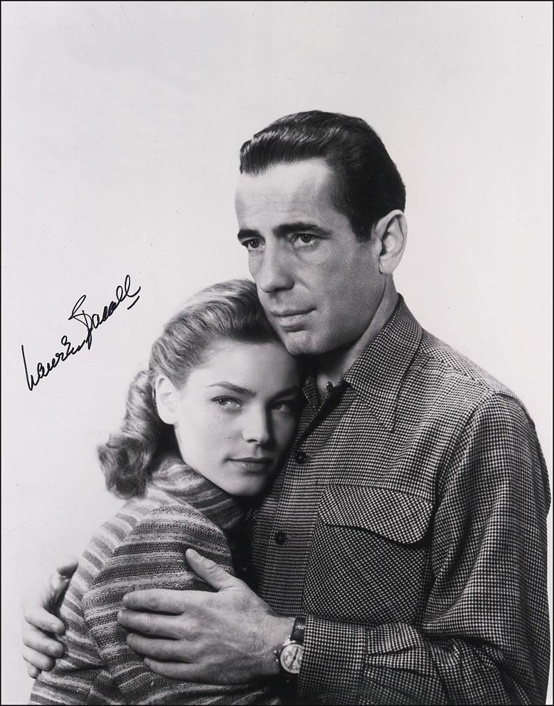 Glossy 11 x 14 photo of Bacall in the arms of Humphrey Bogart, signed in black felt tip by Bacall. In very fine condition. Pre-certified PSA/DNA and RRAuction COA.