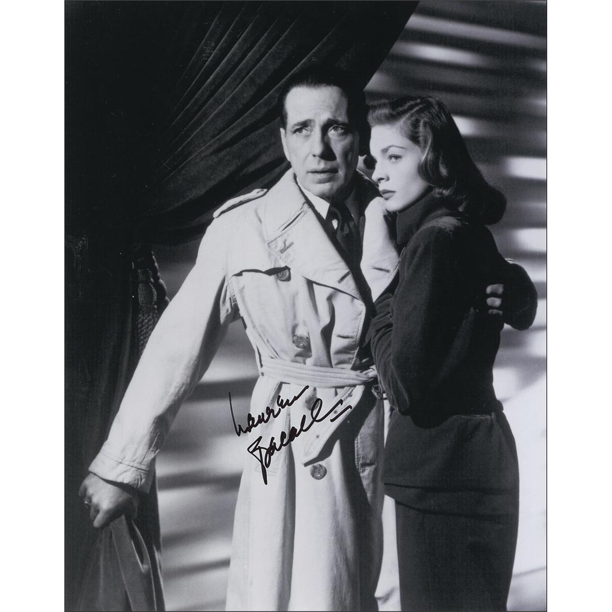 Glossy 11 x 14 photo of Bogie and Bacall, signed in black felt tip, “Lauren Bacall.” In fine condition.