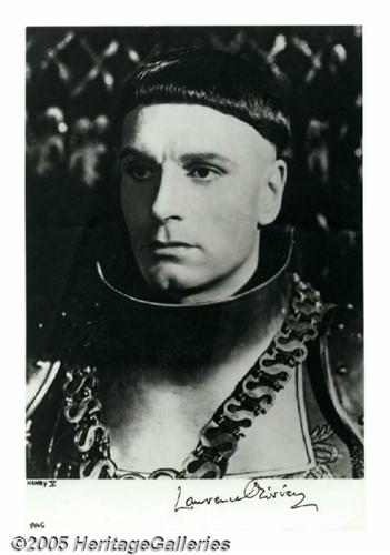 <B>Laurence Olivier Signed Photograph.</B></I> A signed 8" x 10" publicity portrait for Sir Laurence's adaptation of "Henry V," one of the legendary actor's many Shakespearean adaptations, and one that earned him a special Academy Award for "his outstanding achievement as actor, producer, and director in bringing 'Henry V' to the screen." A must-have for devotees of classic cinema. <I>With COA from PSA/DNA.</B></I>