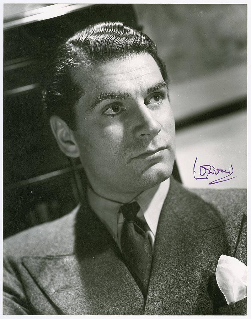 Handsome satin-finish 11 x 14 head-and-shoulders photo of Olivier in a jacket and tie, signed in purple felt tip. In fine condition.