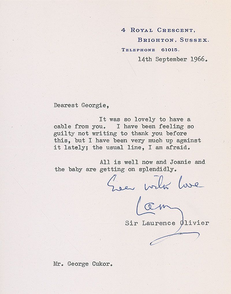 TLS signed “Larry,” one page, 5.5 x 7, personal letterhead, September 14, 1966. Letter to George Cukor. In part: “It was so lovely to have a cable from you…All is well now and Joanie and the baby are getting on splendidly.” In very fine condition.