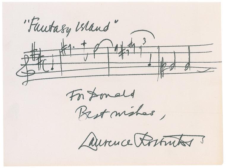 AMQS on a 4 x 3 off-white card, Rosenthal pens three bars of music to ‘Fantasy Island,’ signing “For Donald, Best wishes, Laurence Rosenthal” and adding the title at the top of the card. In fine condition.