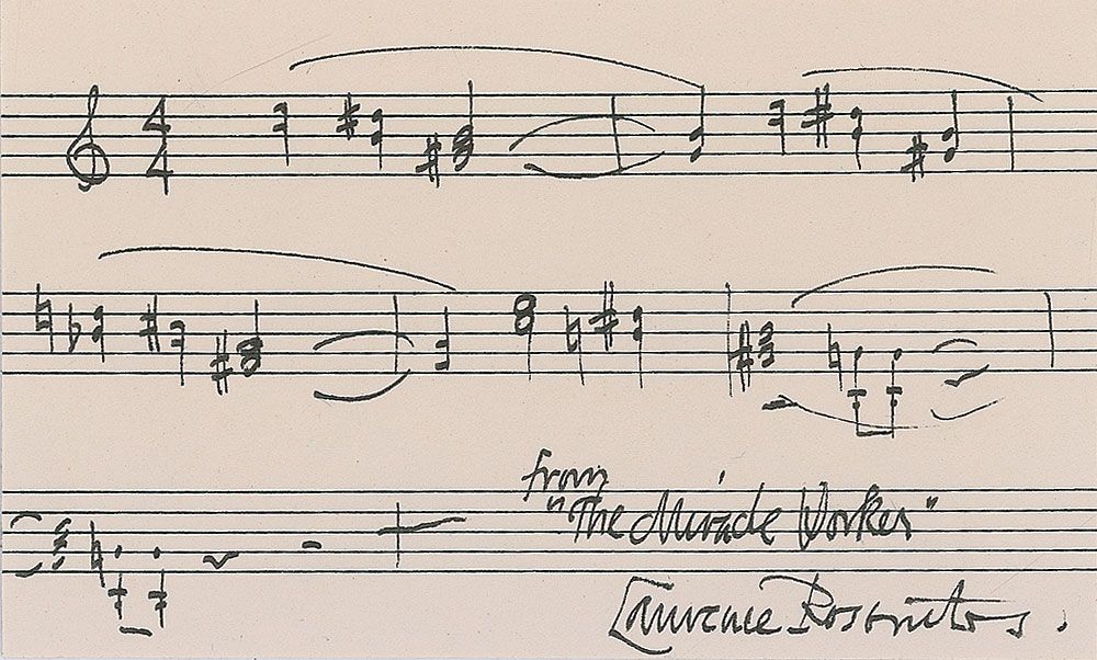AMQS on an off-white 5 x 3 musically-lined card. Rosenthal pens six bars of music from ‘The Miracle Worker,’ signed and titled at the conclusion. In fine condition.