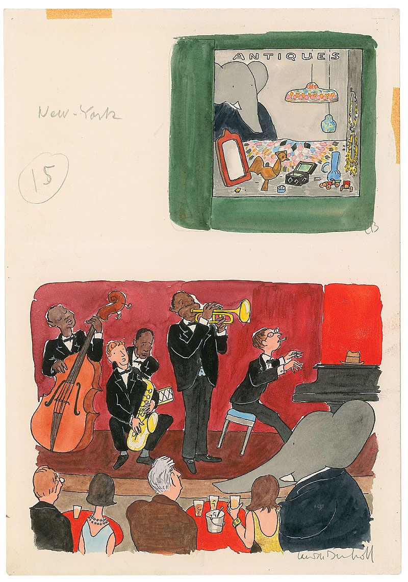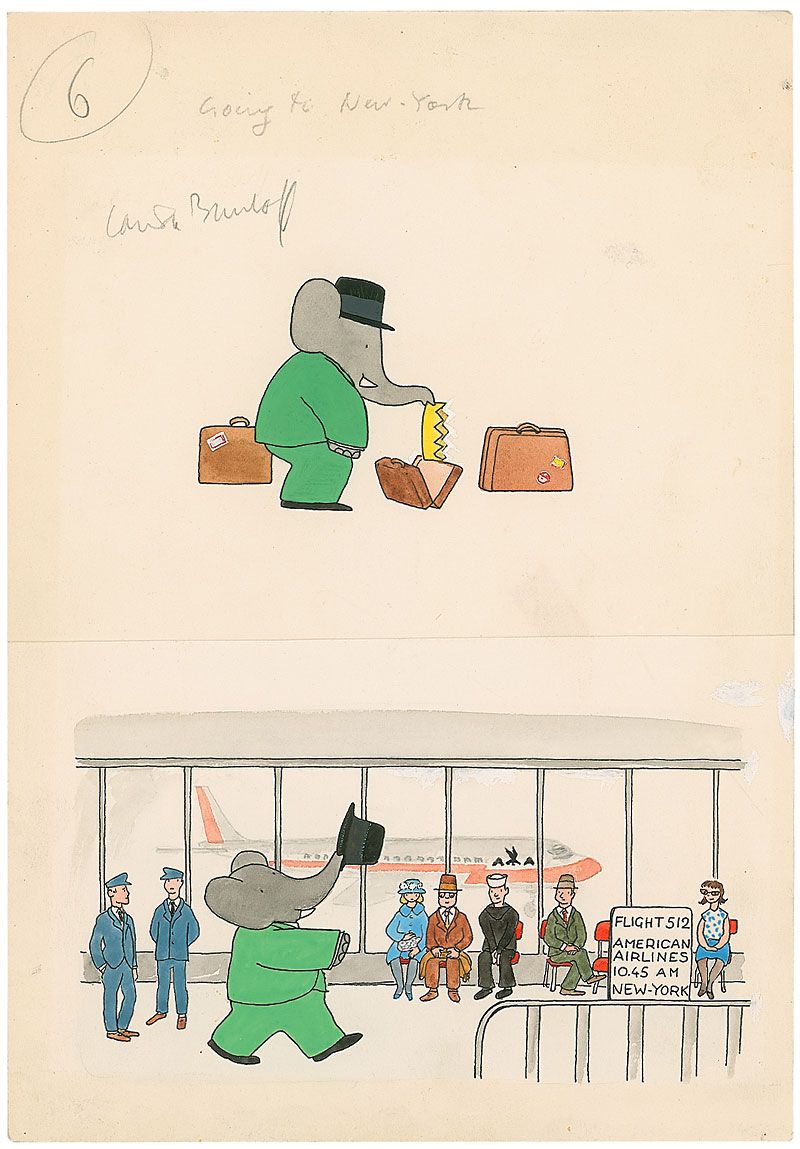 Author and illustrator (b. 1925) best known for continuing the Babar the Elephant series of children's books, created by his father. Four original ink and watercolor Babar illustrations on two 8.25 x 12 off-white sheets. The four individual scenes are Babar packing his crown in a suitcase; Babar walking through the airport with an American Airlines plane in the background; Babar window shopping at an antique store; and Babar sitting in the front row of a jazz club. Each page is signed in pencil by Brunhoff, labelling the first page, “Going to New York,” and the second page, “New York.” These illustrations may have been for the 1965 book Babar Comes to America. In fine condition.