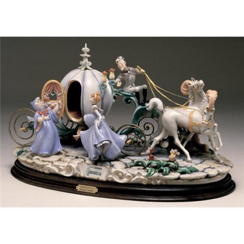 Cinderella. . . a story that has been imortalized in opera, ballet, fairy tales, film, and finally, exquisite porcelain. One of the most charming moments in filmmaking comes to life in this scene of enchantment and beauty. The Fairy Godmother beckons Cinderella to step into the elegant coach. In place of her rags, Cinderella wears a beautiful ball gown, a rat has been transformed into a coachman, and two mice into gallant white steeds! Richly decorated, the magic of this special moment is now yours to enjoy forever. Size: 13" high x 23" wide x 12" deep TOTAL PIECES MADE: 439<BR>Free Shipping in the continental US