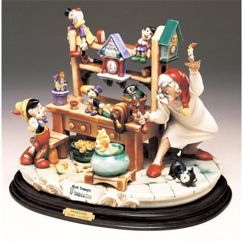 Pinocchio is Truly Alive! Geppetto discovers that his dream has come true the marionette he carved and named Pinocchio has come to life. An inspired scene filled with childlike wonder, its meticulous attention to detail makes this a favorite with collectors. Jiminy Cricket, Cleo the goldfish and Figaro the cat add their delightful presence to this richly embellished work of art. Size: 13" high, x 17-1/4" wide x 12-1/2" deep TOTAL PIECES MADE: 391<BR>Free Shipping in the continental US