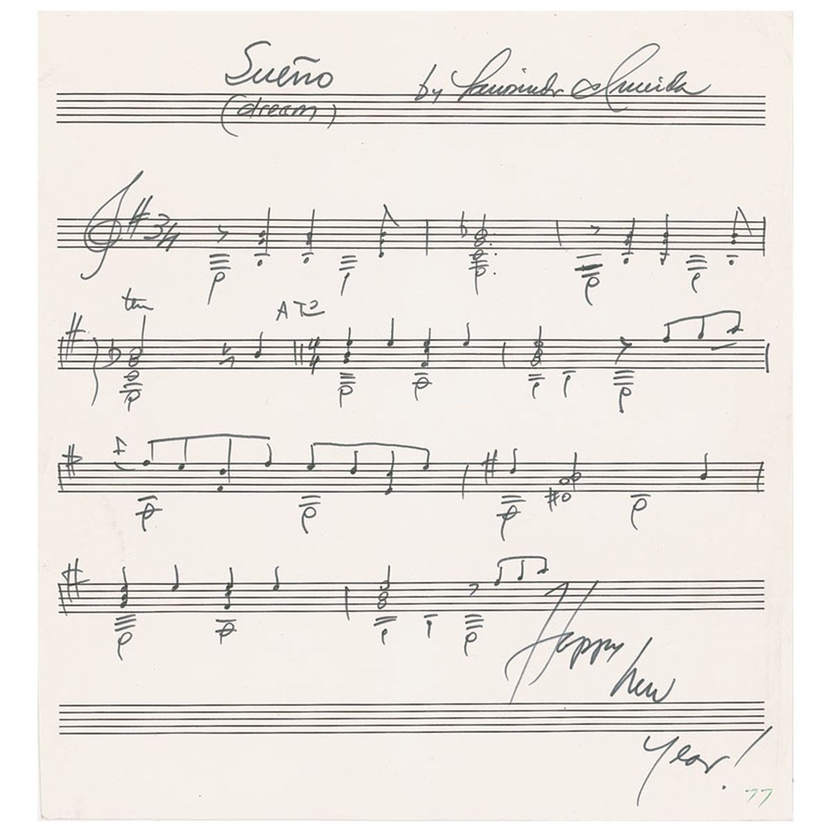 Brazilian virtuoso guitarist and composer (1917–1995) famous for his song ‘The Girl from Ipanema.’ AMQS on an off-white 9 x 9.75 sheet of musically-lined sheet. Almeida pens 11 bars from his song, ‘Sueno (Dream),’ signing at the top, and adding “Happy New Year!,” at the bottom. In fine condition, with small ink notation to lower right corner, and some light edge creasing.