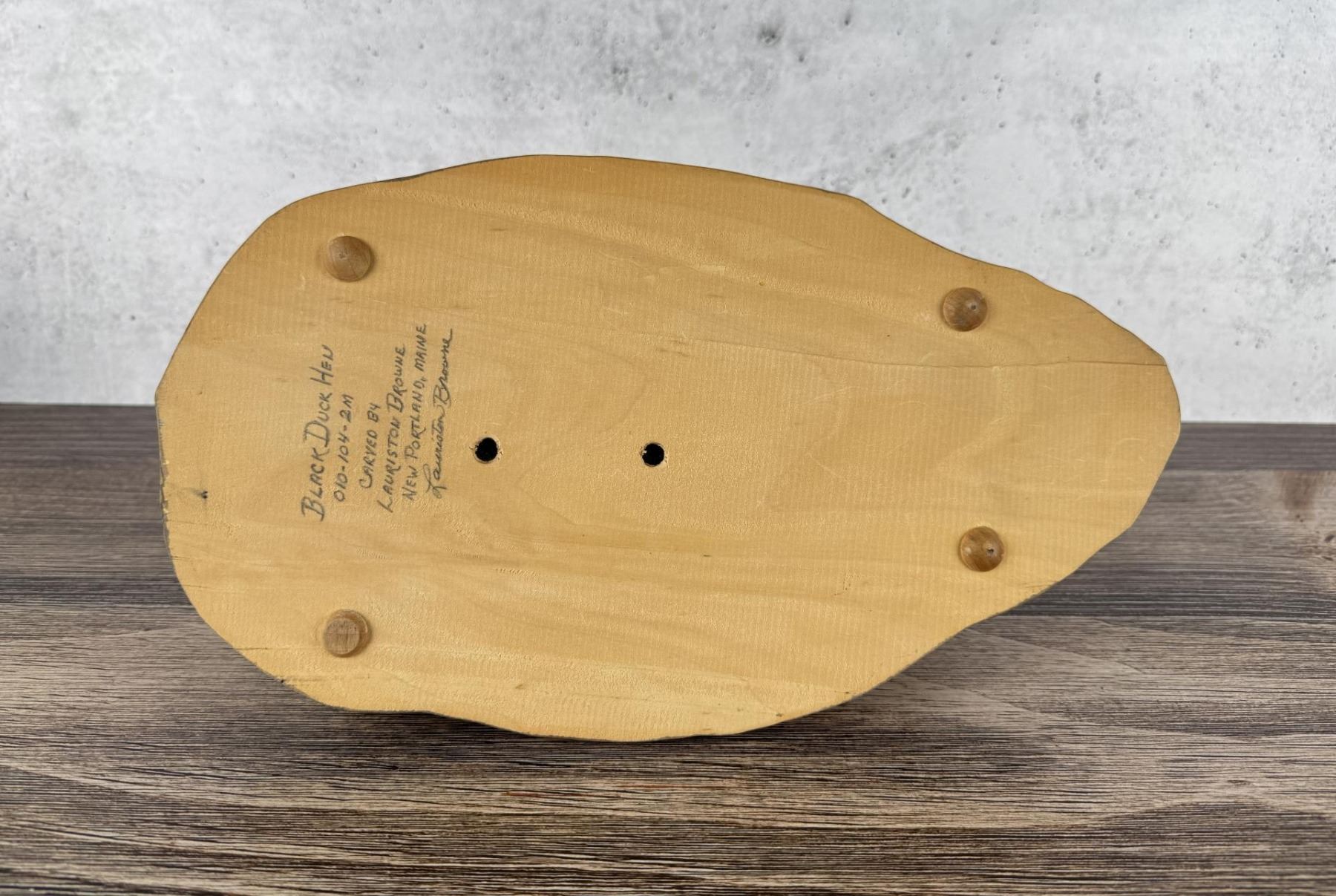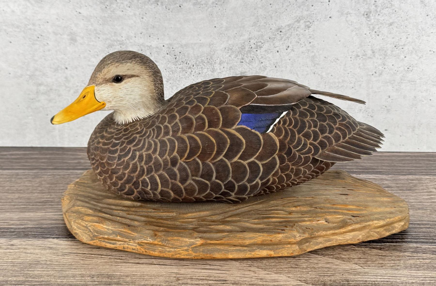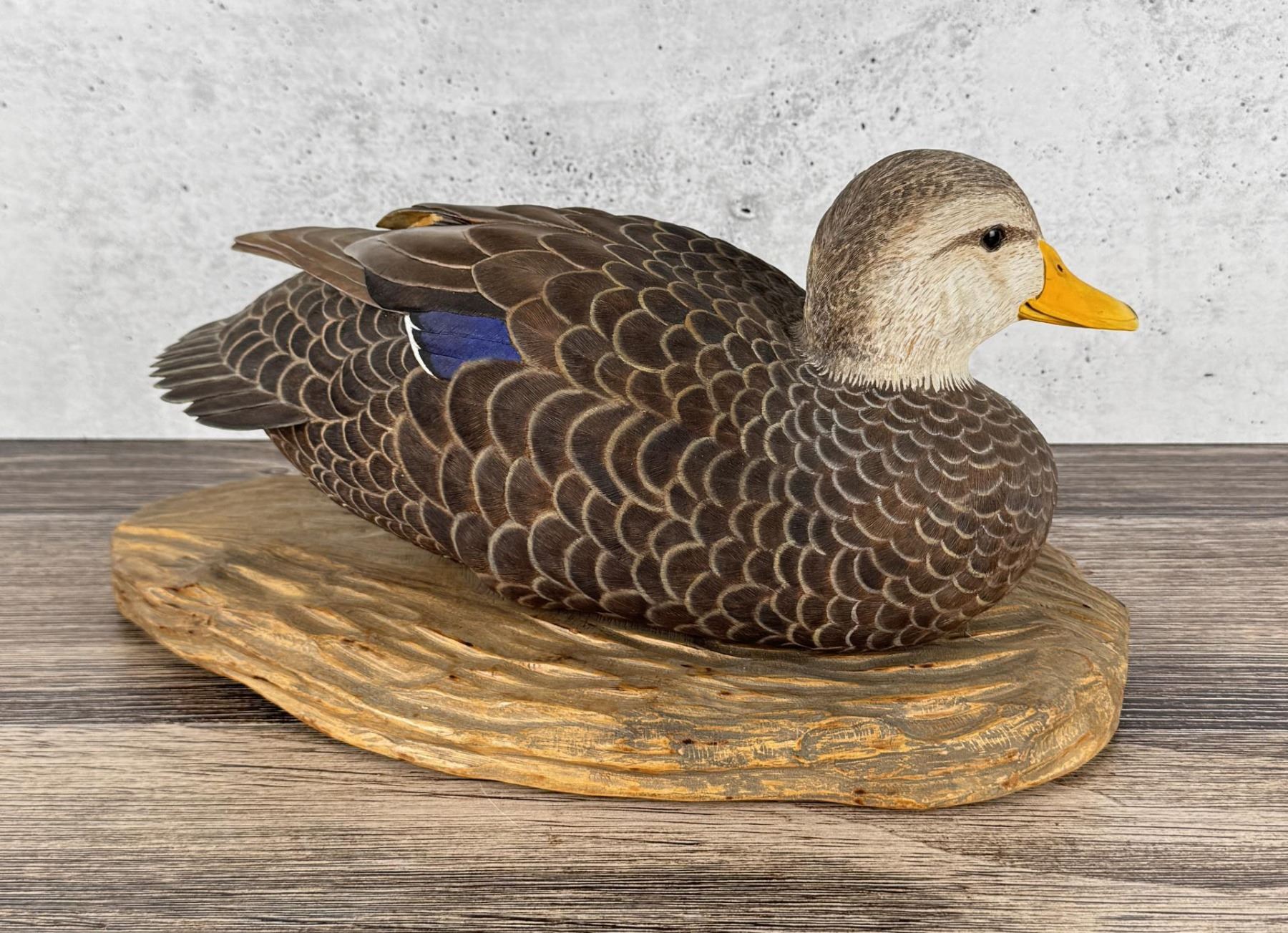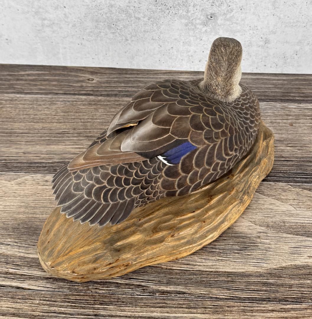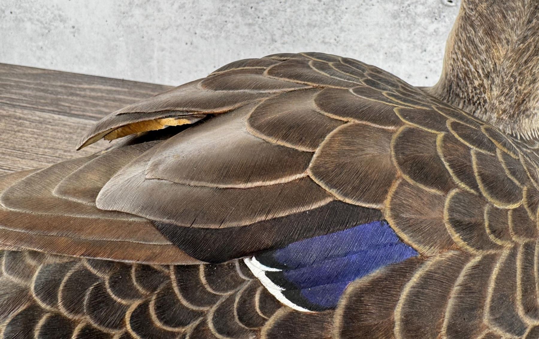 14 1/2" by 8 1/8" by 6 3/4". One feather is missing as shown.