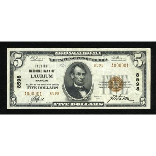 <B>Laurium, MI</B></I> - $5 1929 Ty. 2 <B>The First NB</B></I> Ch. # 8598<BR> This exciting Number 1 note is the first to surface on this Houghton County bank which has only a couple of dozen small size reported. While it does have a couple of folds, the deep original embossing confirms that this great <B>Extremely Fine</B></I> note never really circulated but picked up its handling in storage. This is a wonderful opportunity for Michigan or Serial Number 1 collectors.<BR><BR><b>Shipping:</b> Coins & Currency (<a target="_blank" href="http://www.heritageauctions.com/common/shipping.php">view shipping information</a>)