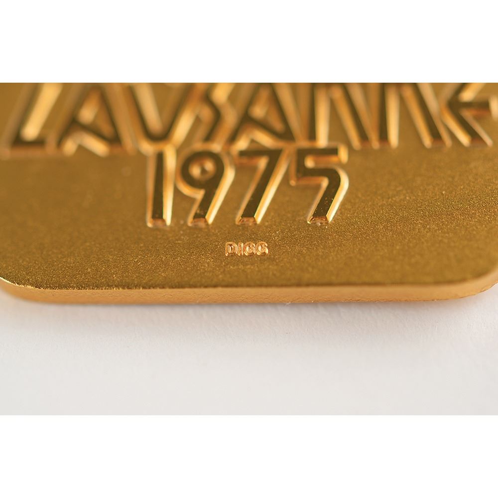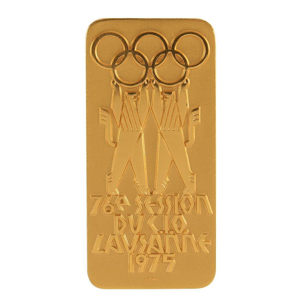 Badge from the 76th International Olympic Committee session held in Lausanne, Switzerland, in 1975, measuring 25 mm x 53 mm, depicting two lions holding up the Olympic rings, with text below: "76e Session du C.I.O., Lausanne 1975."