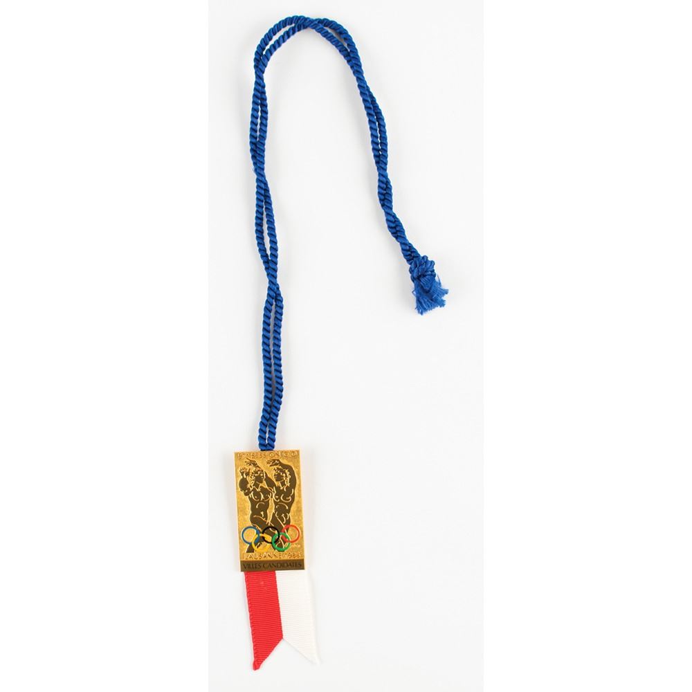 Candidate city delegate's badge from the 91st International Olympic Committee session held in Lausanne, Switzerland, in 1986, measuring 30 mm x 57 mm with red-and-white ribbon below, featuring enameled Olympic rings over ancient figures, with text reading: "91 Session CIO, Lausanne 1986, Villes Candidates." Complete with its blue cord. This significant session resulted in Albertville being selected as host for the XVI Olympic Winter Games, Barcelona being selected as host for the Games of the XXV Olympiad, and the decision to separate the Winter and Summer games into alternating even years beginning in 1994.