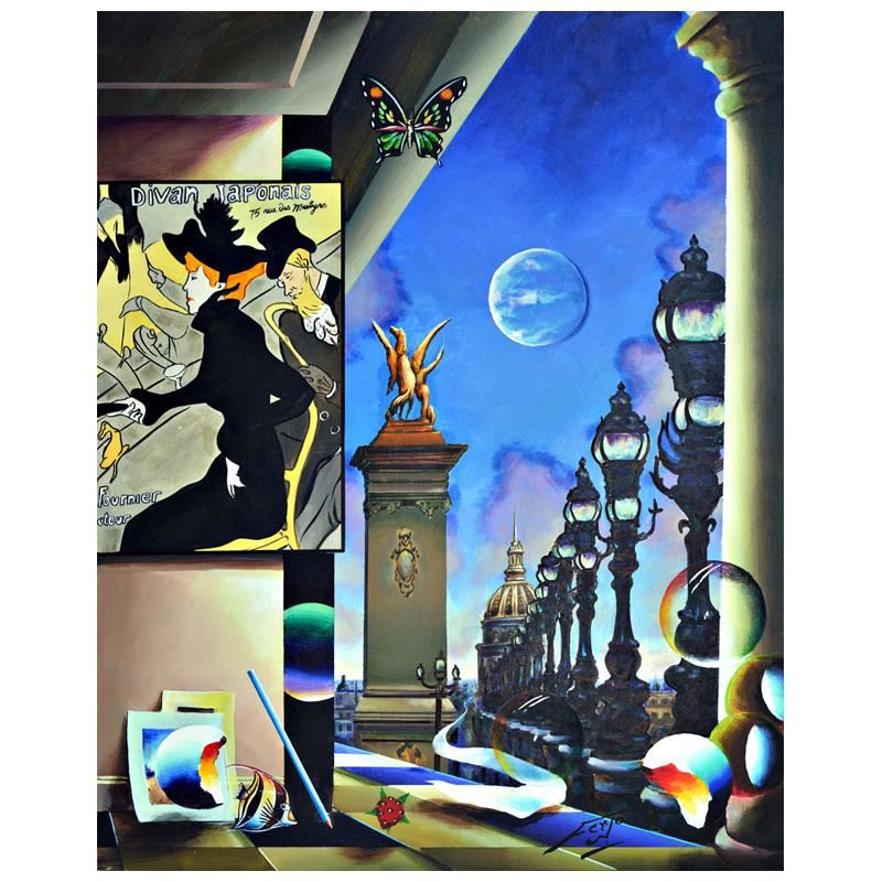 "Lautrec in Prague" is an original painting, oil on stretched canvas, by Ferjo. Hand signed by the artist, this piece comes with a letter of authenticity. Measures approx. 30" x 24" (image).