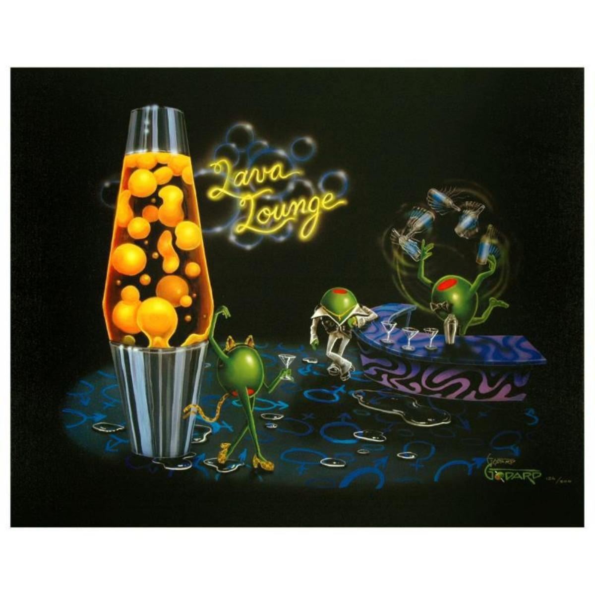 "Lava Lounge" is a numbered limited edition giclee on canvas, from a sold out edition, by Michael Godard bearing the artist's authorized signature. This piece is gallery wrapped and includes a Certificate of Authenticity. Measures approximately: 28" x 35".