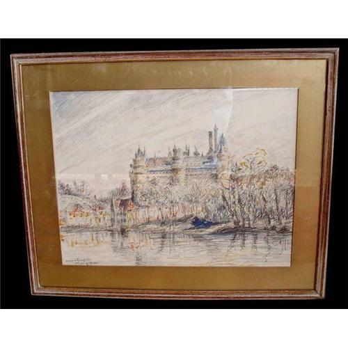 Francois Laval b.1895 Gouache and Pencil Painting Château de Pierrefonds 1933 Chateau 14th century Castle Middle Ages Medieval Listed French France