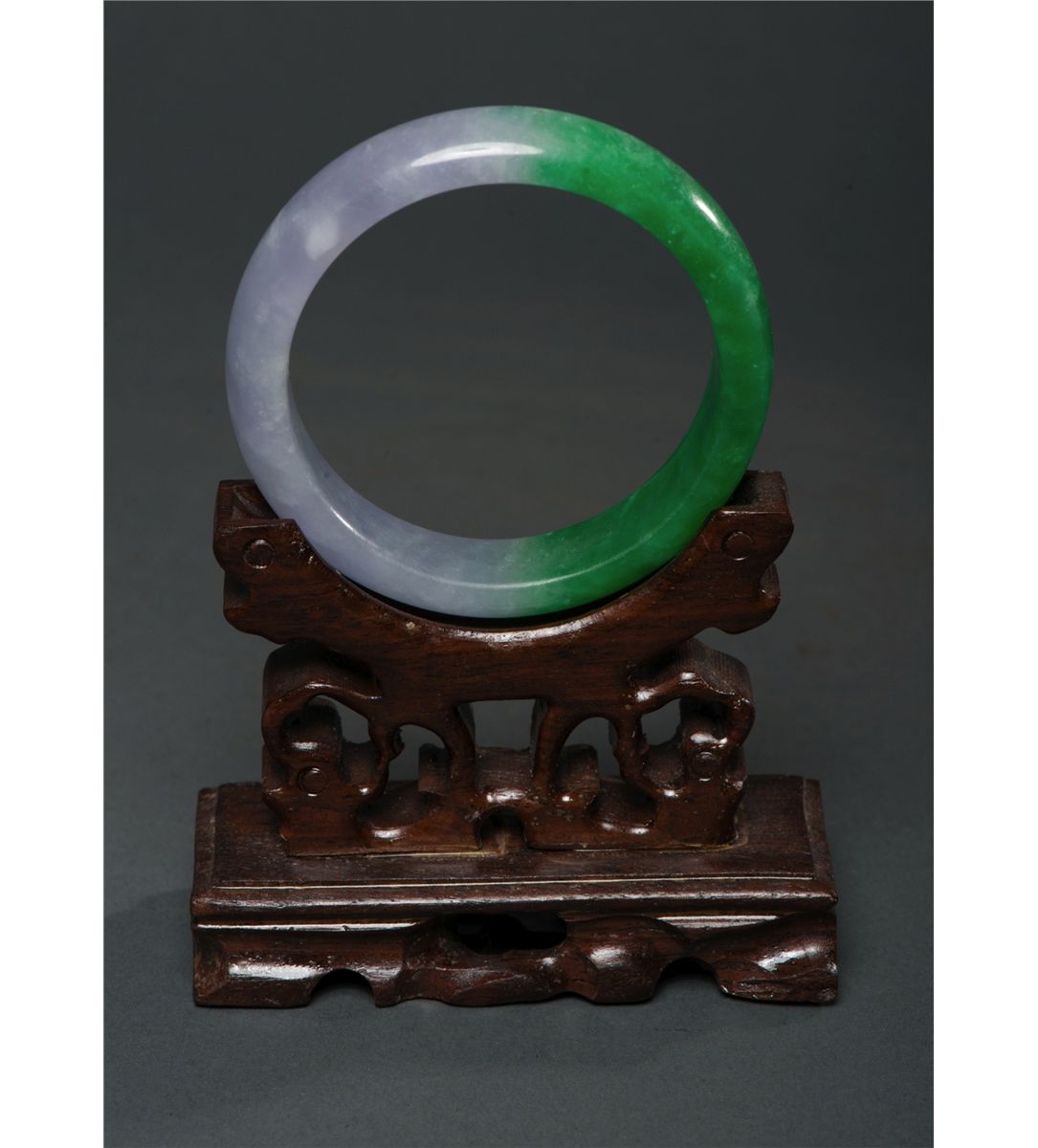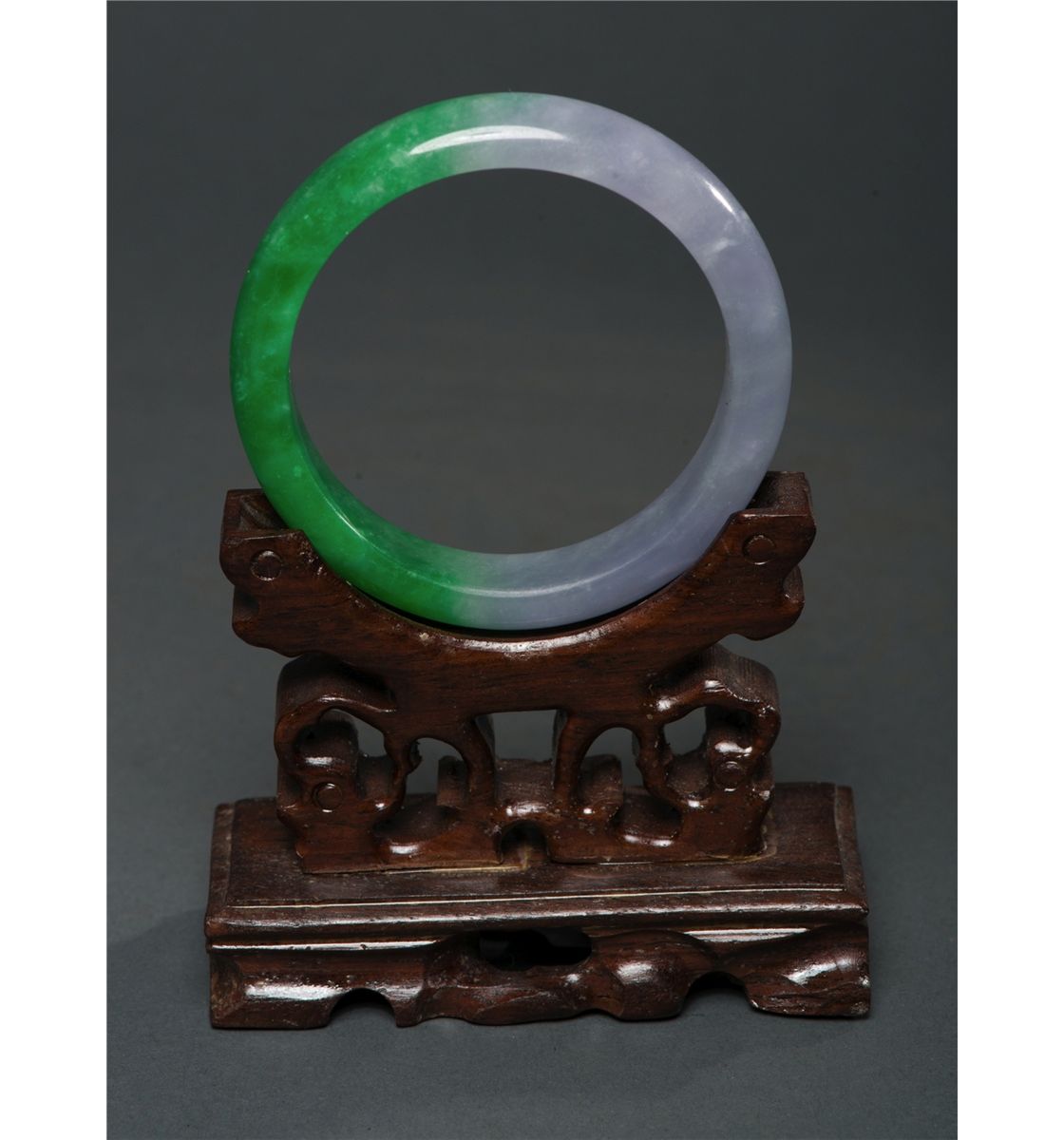 Chinese jadeite carved circular bangle, of lavender and emerald green tone, semi-rounded edge with good translucency; D: 7.25 cm, inner D: 6 cm, 64 grams, Density: 3.30, wood stand not included