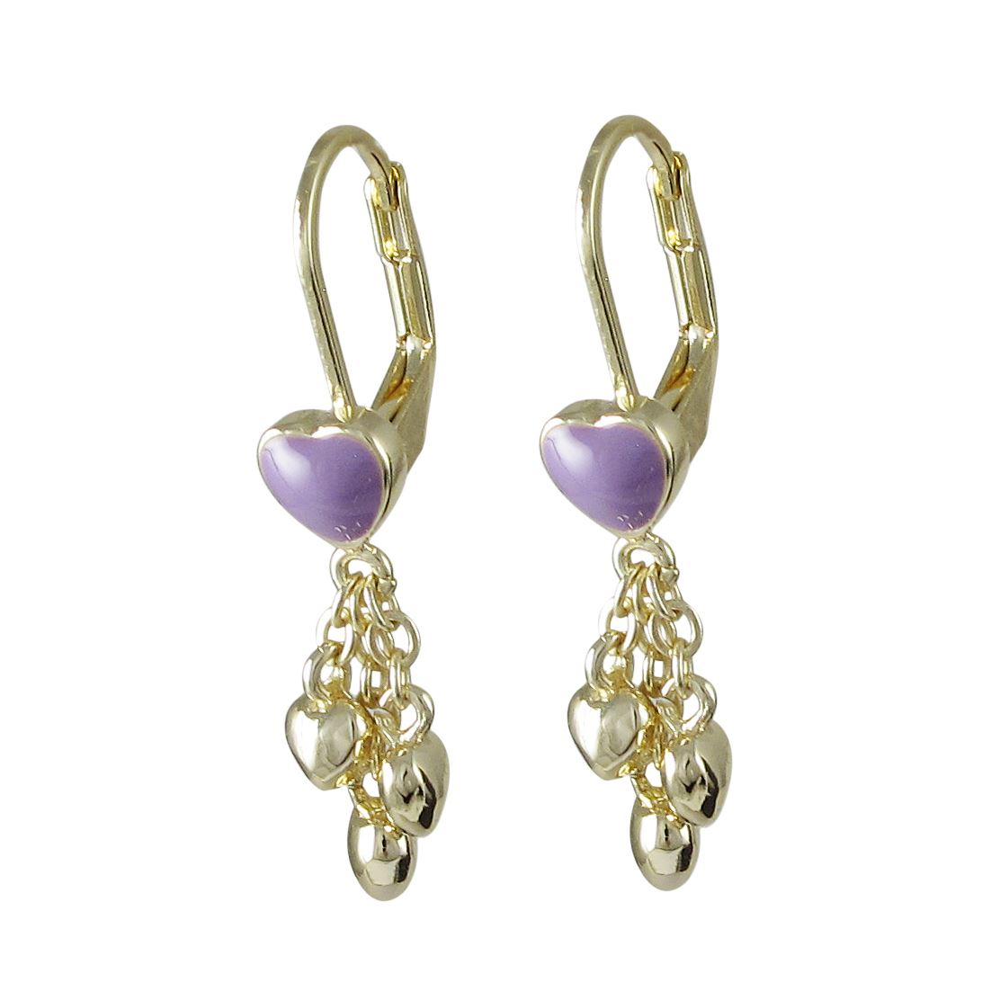 Lavender Enamel Heart On Gold Plated Brass Lever Back Earrings, 3 Small Gold Hearts Dangling, 1.22"