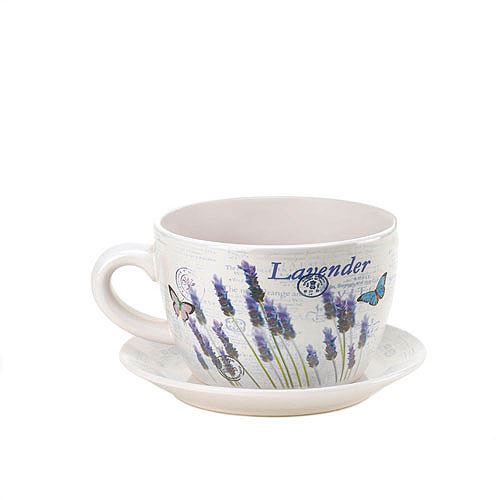 Lavender Fields Teacup Planter **|**|** Exquisite beauty and charming style! This teacup planter is ready to doll up your favorite greenery with its pretty design that features lavender blooms, butterflies and travel stamps. Drain hole in the bottom.Description Details Item weight: 3.2 lbs.Product Dimensions: Teacup: 9-1/4 x 7-1/2" x 4-5/8" high; plate: 9" diameter x 1-1/4" high. Product Material: Dolomite.UPC Code: 849179020576.Packaging: 1 SET"