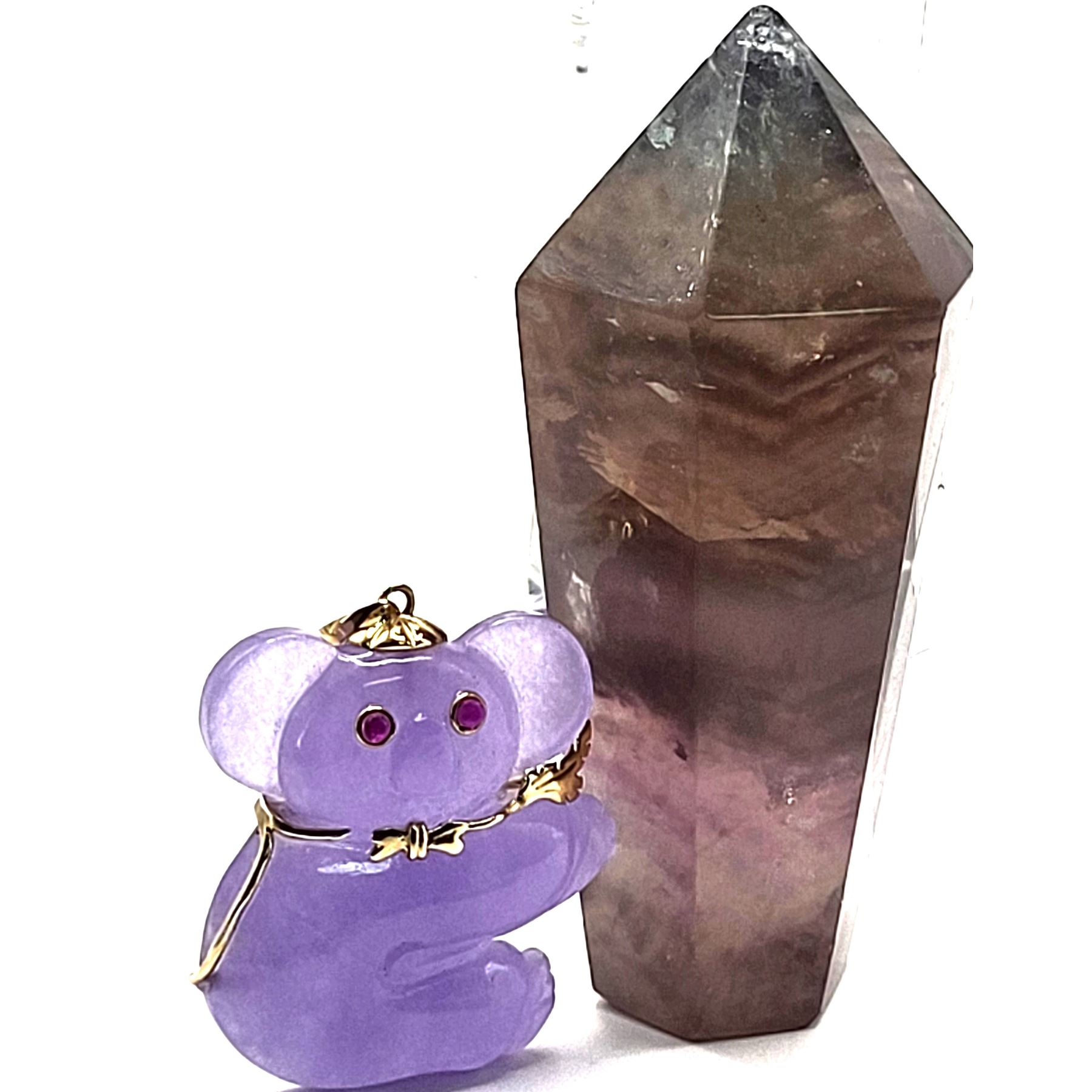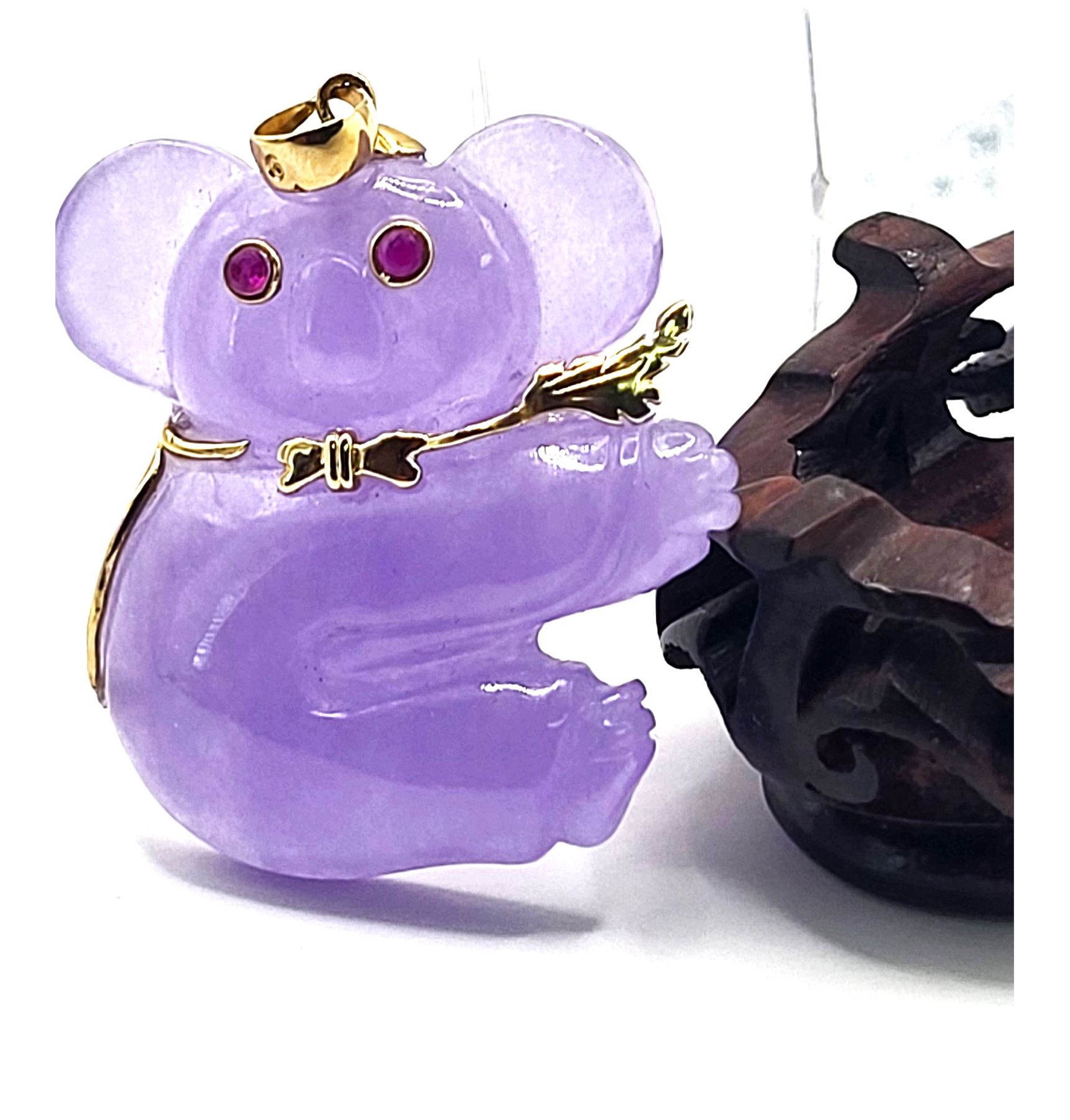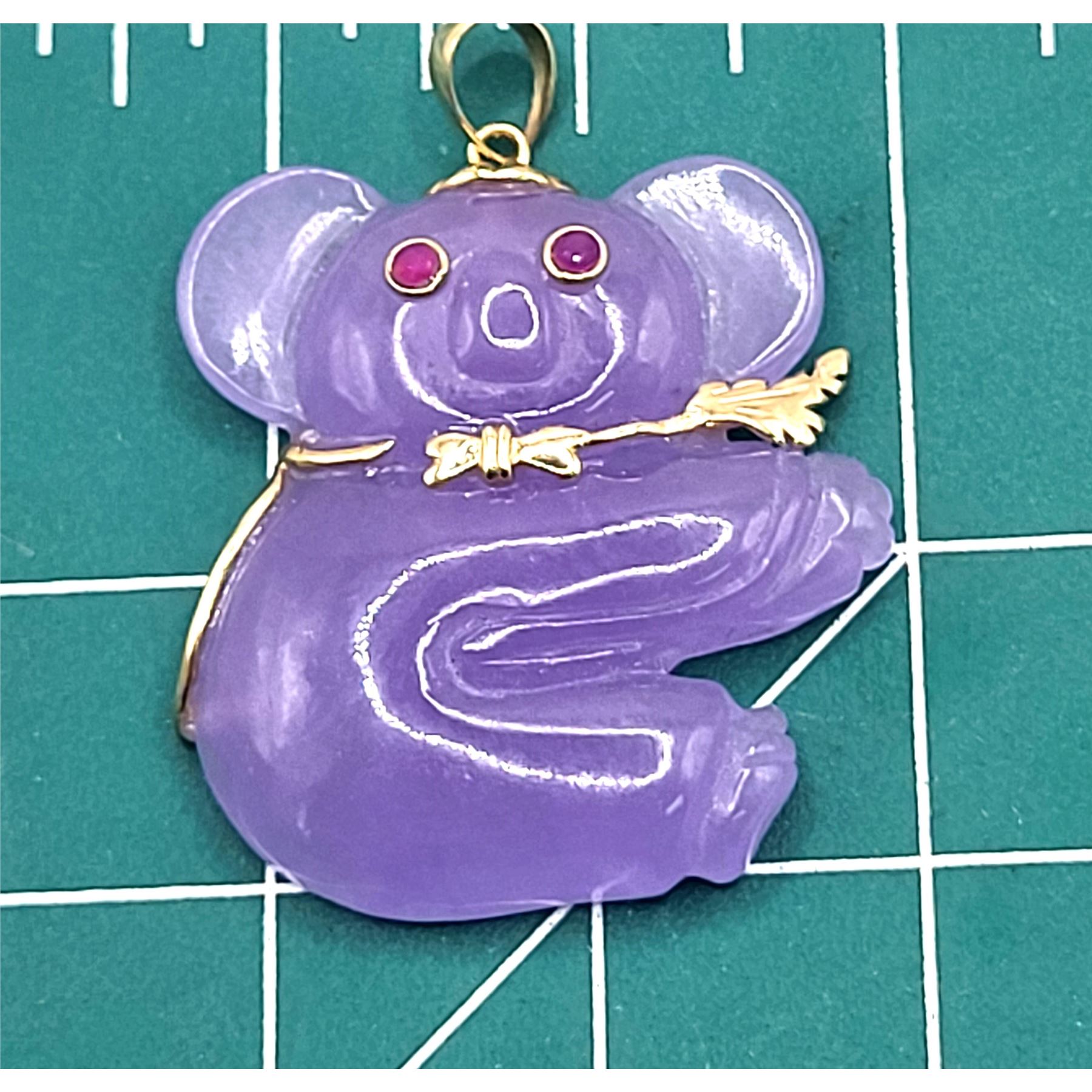 You will love this 14 karat yellow gold pendant with a Koala bear, carved from Lavender Jadeite with approximately .10 carats total weight of round, faceted, genuine rubies for the eyes.& nbsp; The pendant is approximately 1.25& quot; x 1.25& quot; and the bail can accommodate an approximate 3.5mm chain.