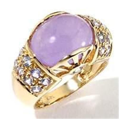 Size 8---An ornate 14kt. yellow gold band embraces one 10x12mm lavender jade (genuine jade dyed lavender) and twenty-two .75ctw. genuine tanzanites. The twenty pave' set and two bezel set tanzanites are bright perwinkle in color.