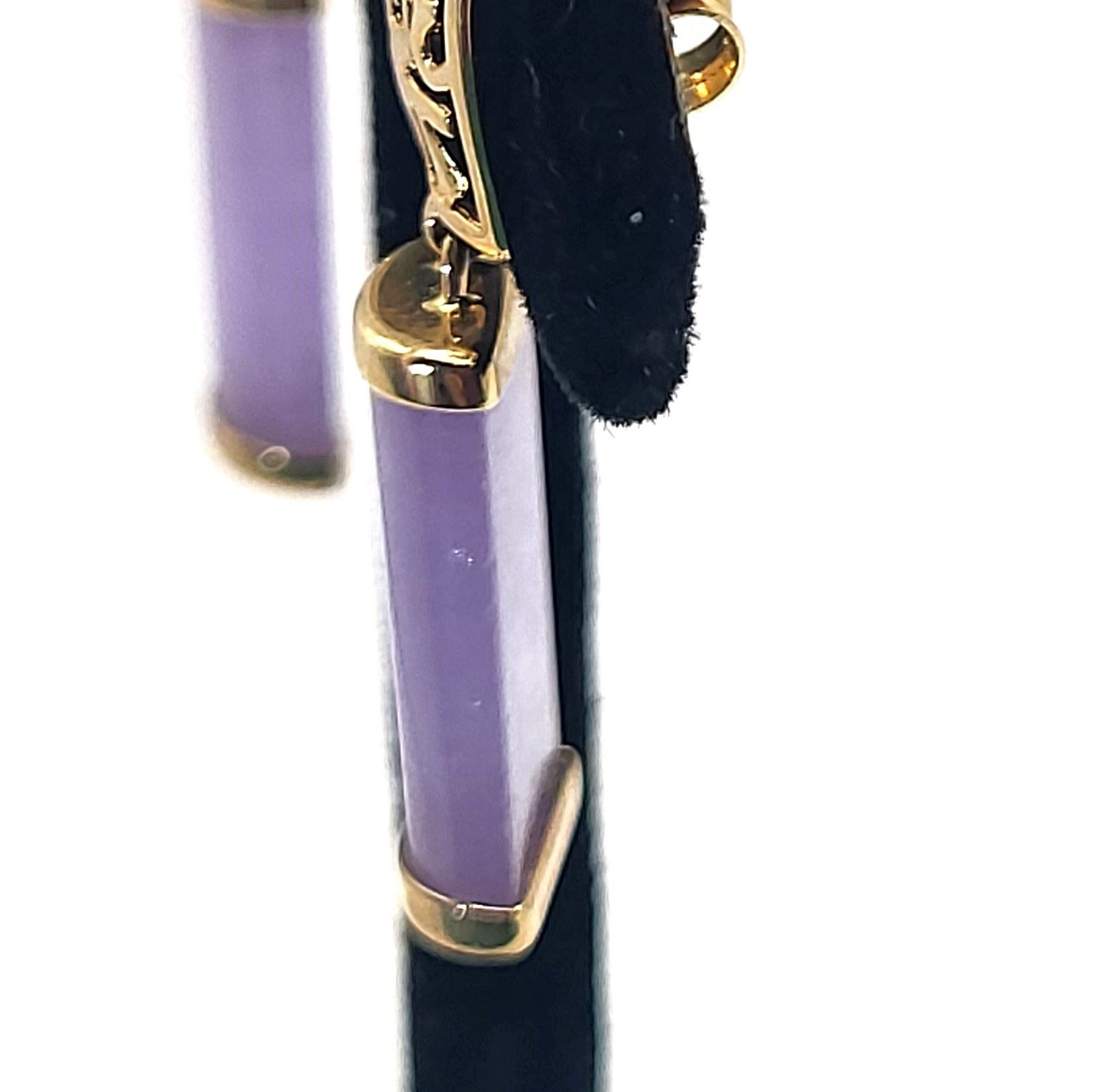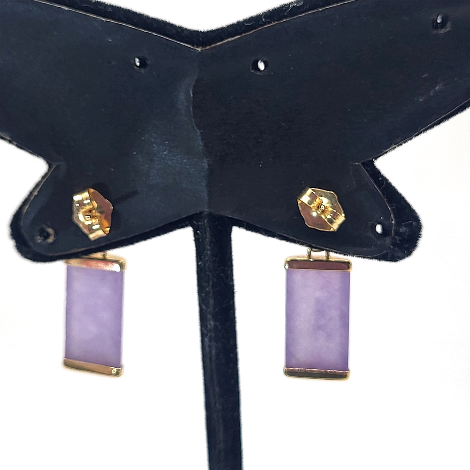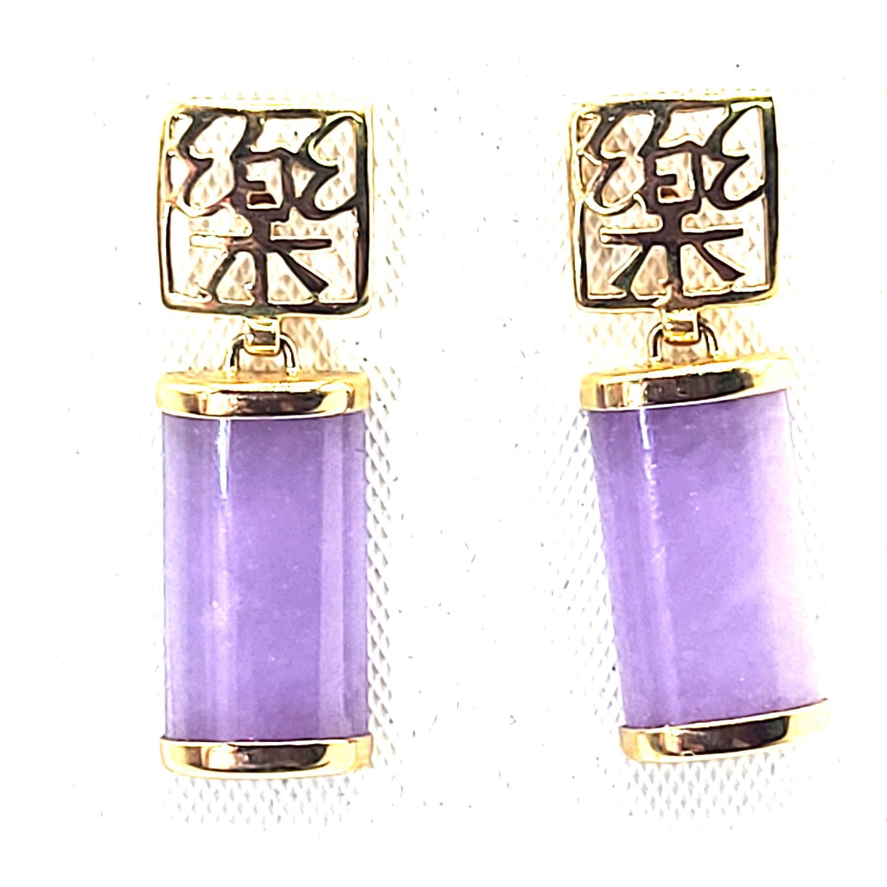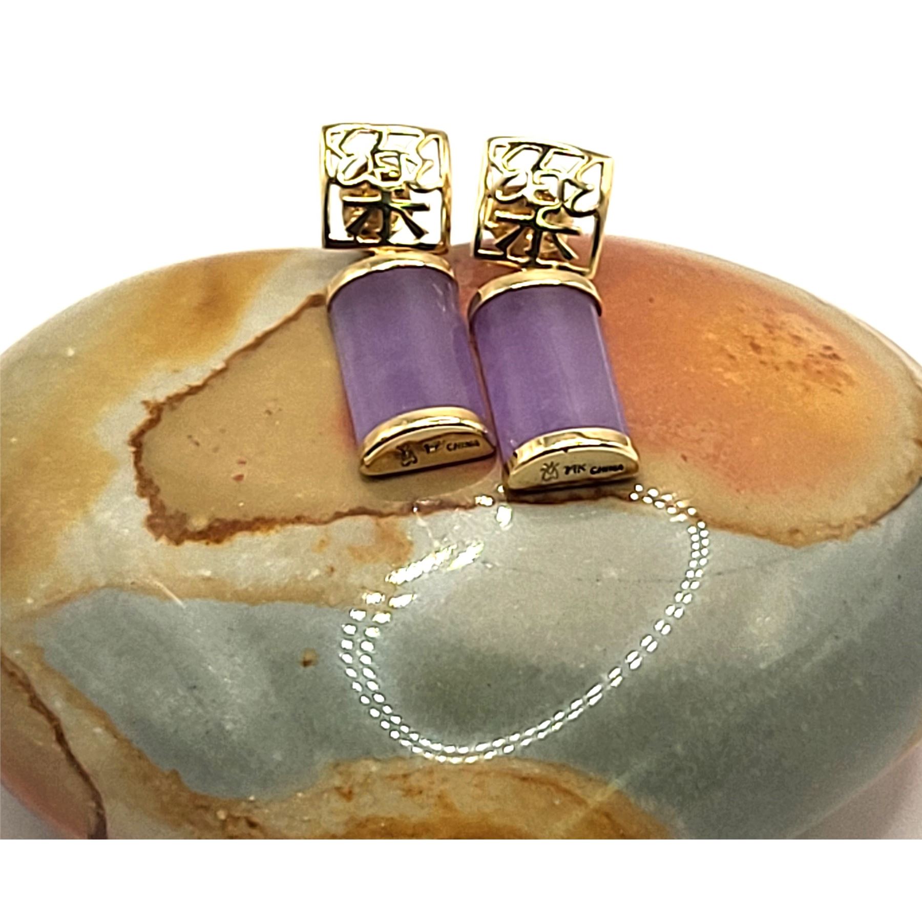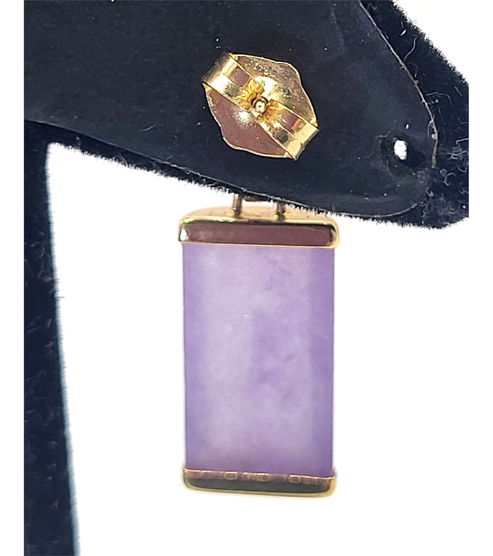Lavender Jadeite bars hang from 14 karat yellow gold earrings with Asian script inside square-shaped ear buttons. The jadeite measures approximately 5/8& quot; x 5/16& quot; and have caps on each end.& nbsp; The earrings attach to the earlobe with posts and friction backs and hang approximately 1& quot;.& nbsp; Admin: 33110/22ag