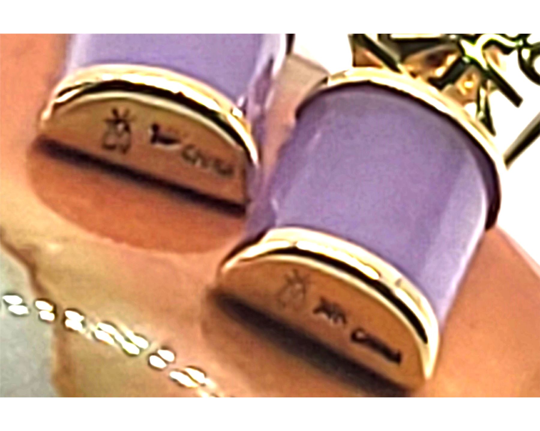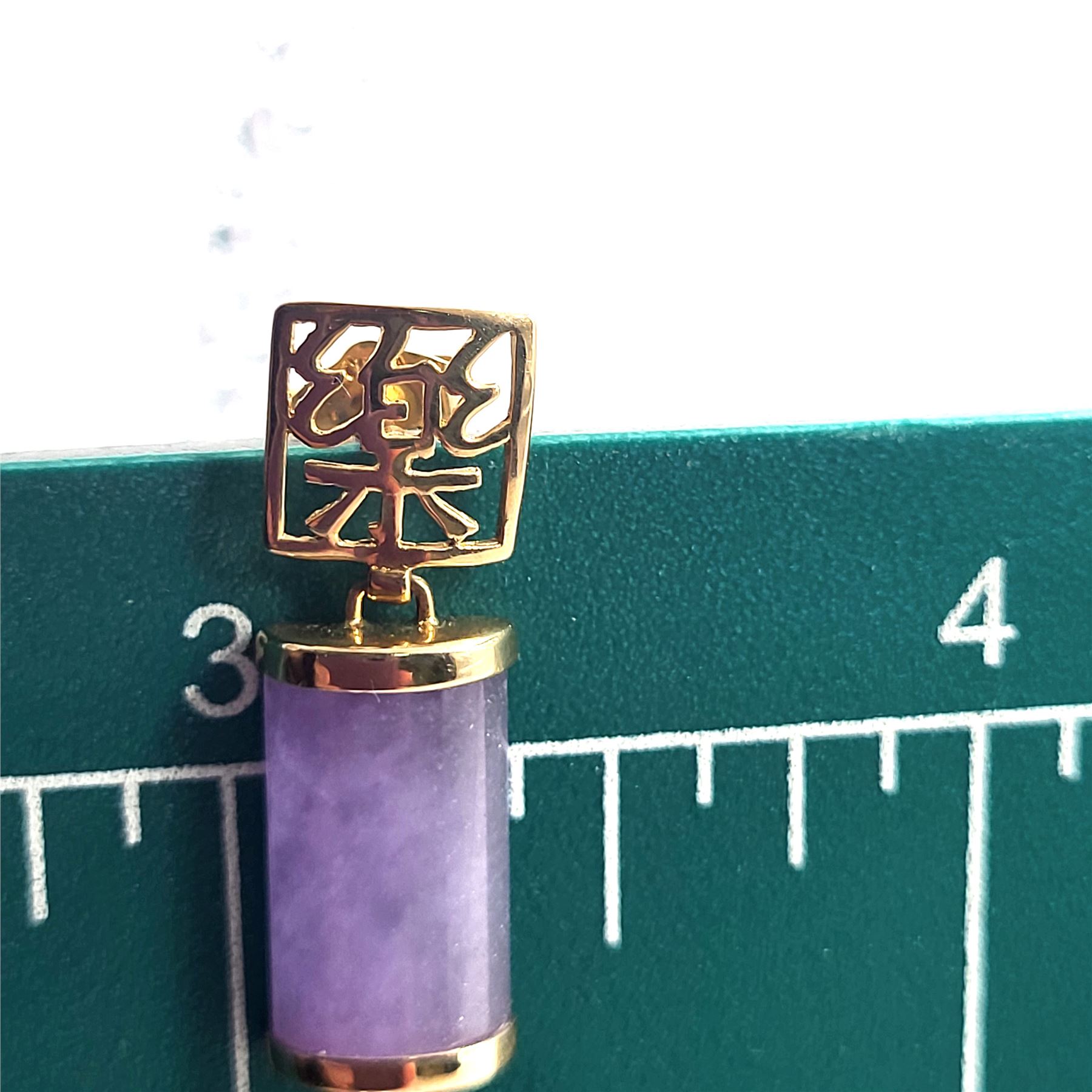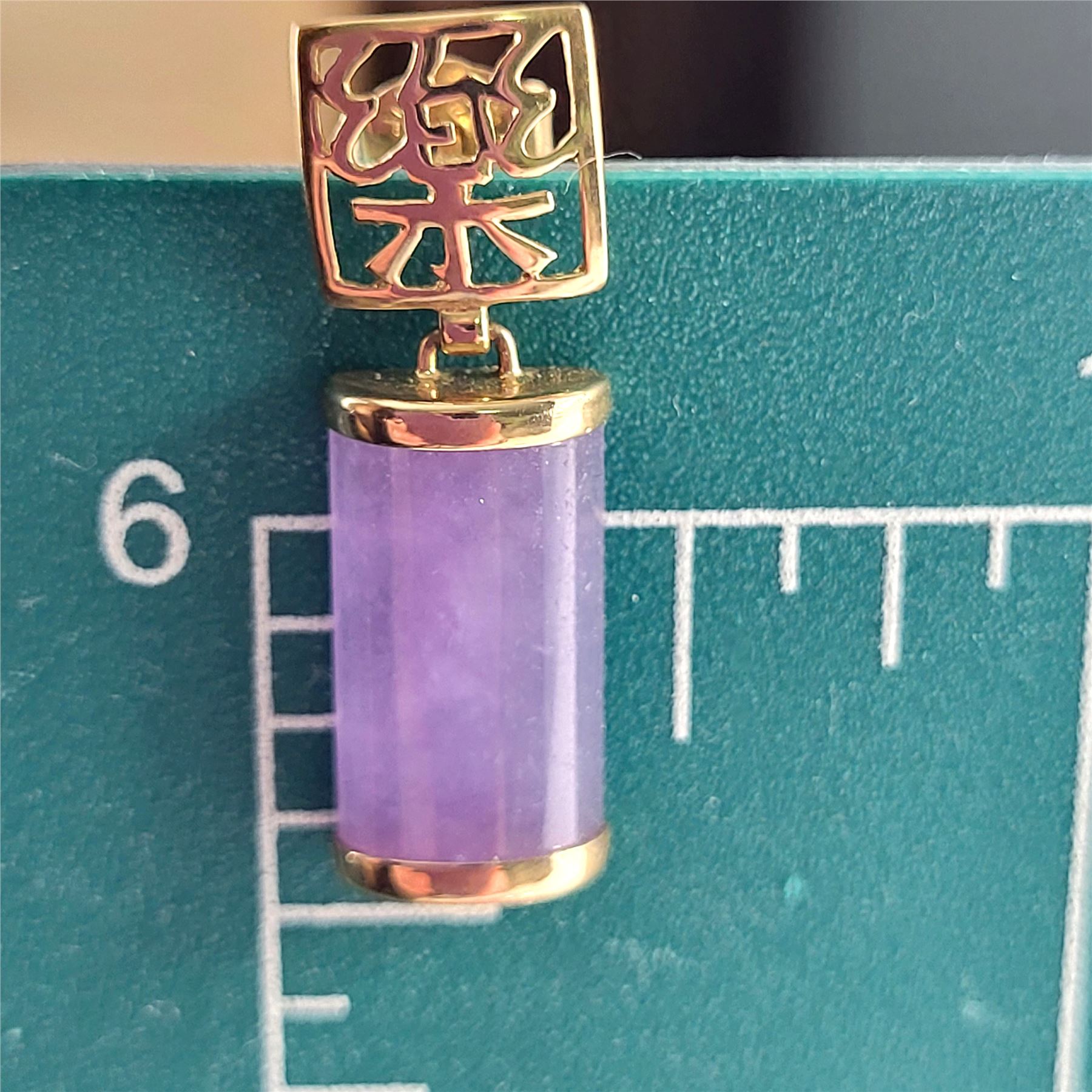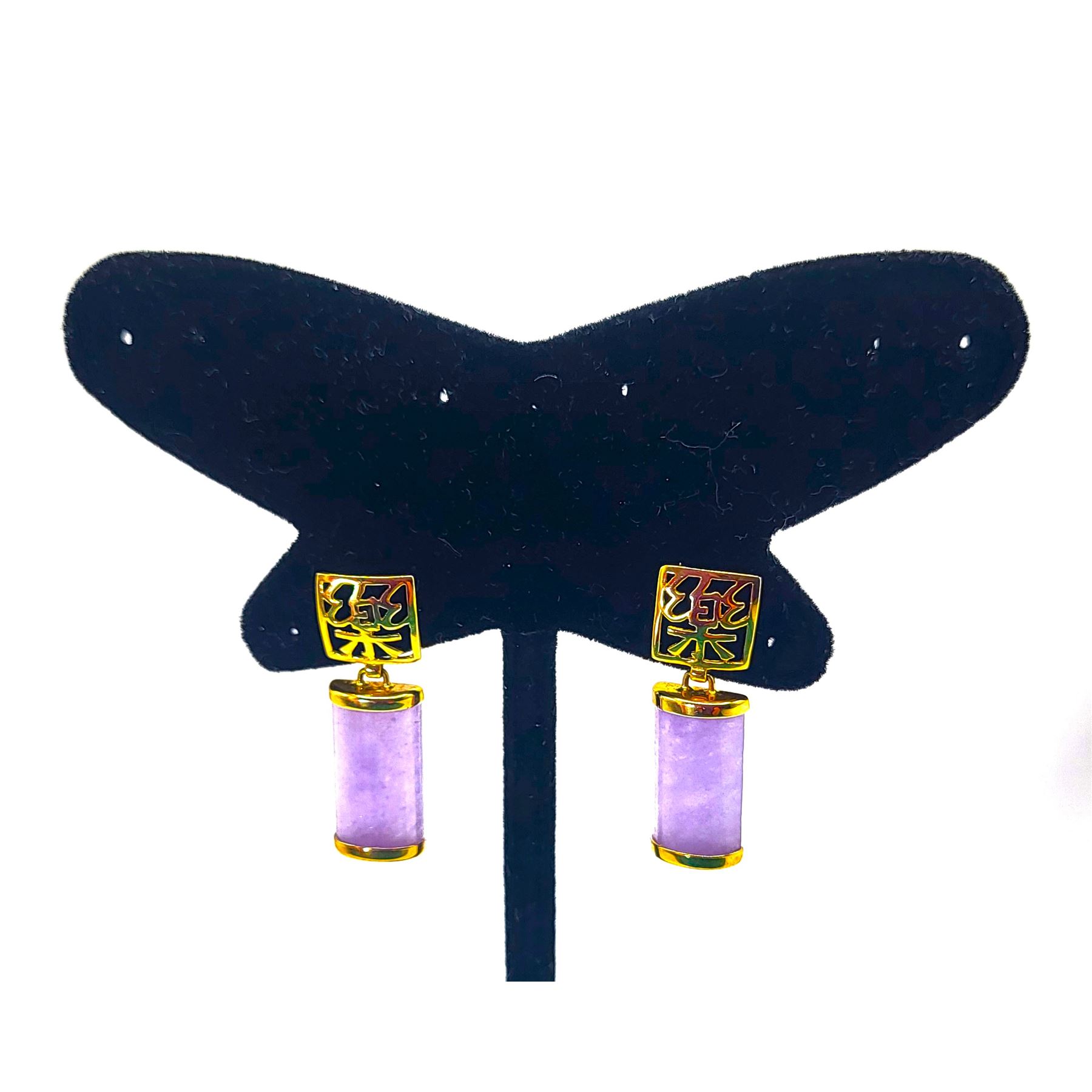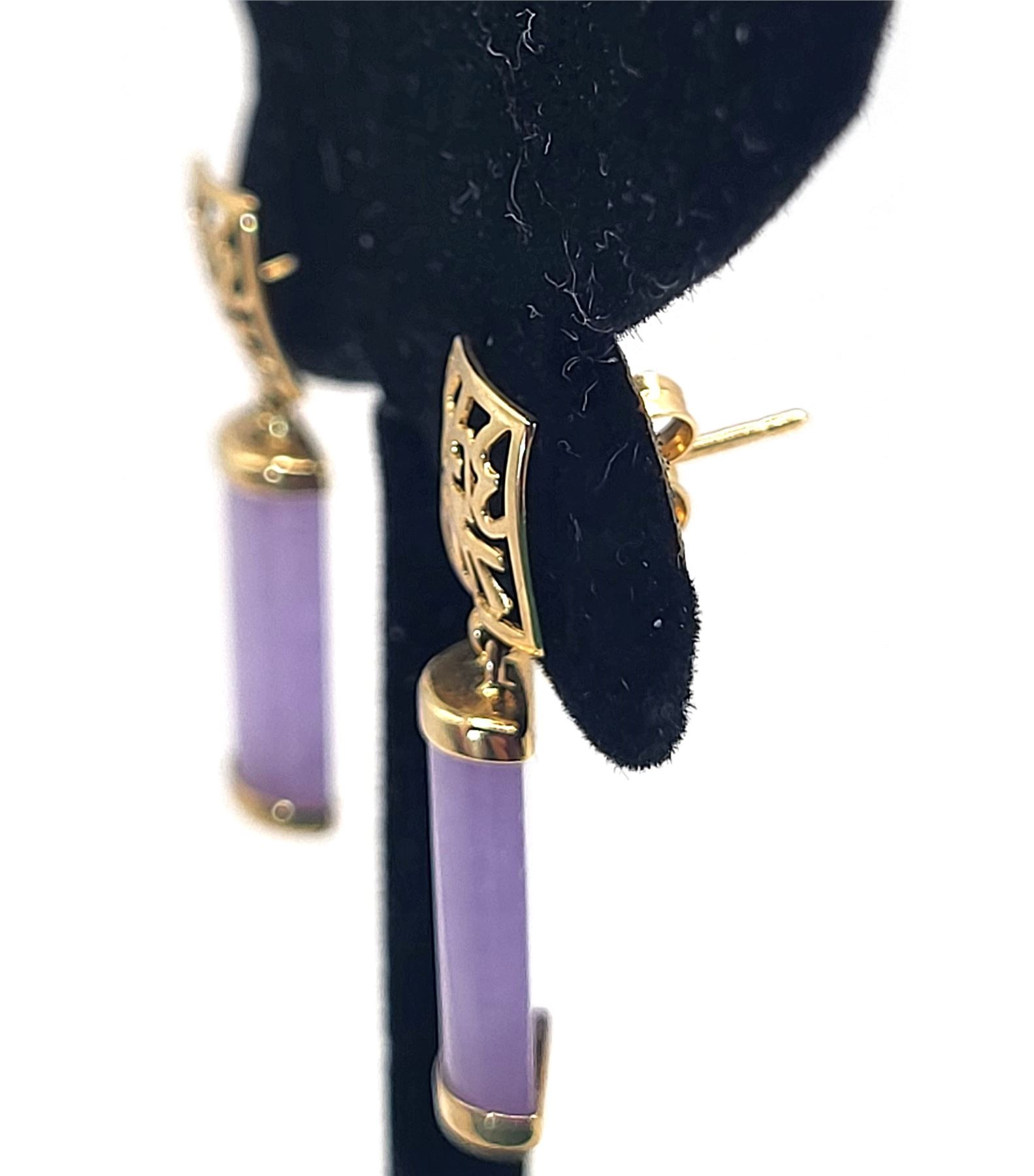 Lavender Jadeite bars hang from 14 karat yellow gold earrings with Asian script inside square-shaped ear buttons. The jadeite measures approximately 5/8& quot; x 5/16& quot; and have caps on each end.& nbsp; The earrings attach to the earlobe with posts and friction backs and hang approximately 1& quot;.& nbsp; Admin: 33110/22ag