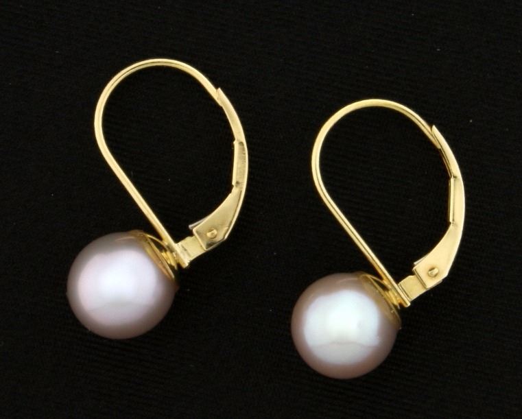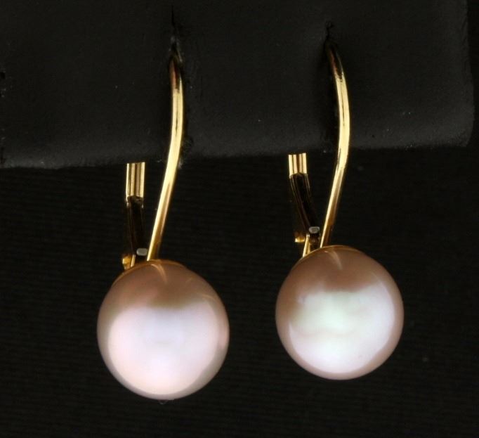 In 14k yellow gold. Each pearl is 8mm with a beautiful lavender color and high luster. 3/4" long with backs. 2.3g.