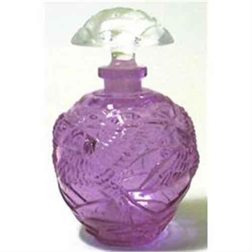 This lovely vintage lavender Art Glass perfume bottle features a pattern of swallows in flight and a clear rose shaped stopper. The bottle measures 4 3/4" tall x 2 3/4" across and is in excellent condition.