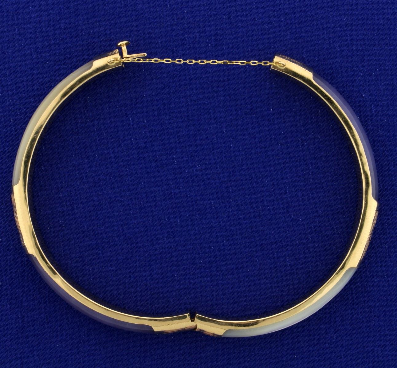 In 14k rose gold. 2 1/4" inside diameter. Hinges open/close for easy putting on. With safety chain on clasp. Hand carved design on gold. 14.8g.