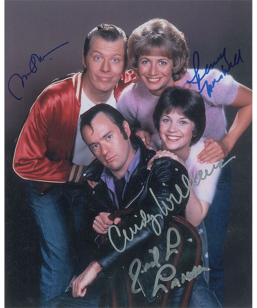 Color satin-finish 8 x 10 photo of the Laverne and Shirley cast, signed in blue felt tip and silver ink by Penny Marshall, Cindy Williams, David L. Lander, and Michael McKean. In fine condition.
