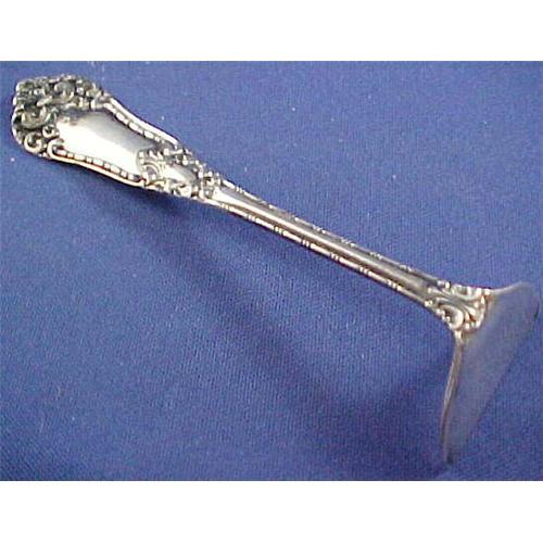 This is a gorgeous sterling silver baby food pusher in the Chester pattern by International. This pattern is ornate on both sides of the handle. This pusher measures 4 1/4" long. It is in extremely good unmonogrammed condition, perfect for gift giving!