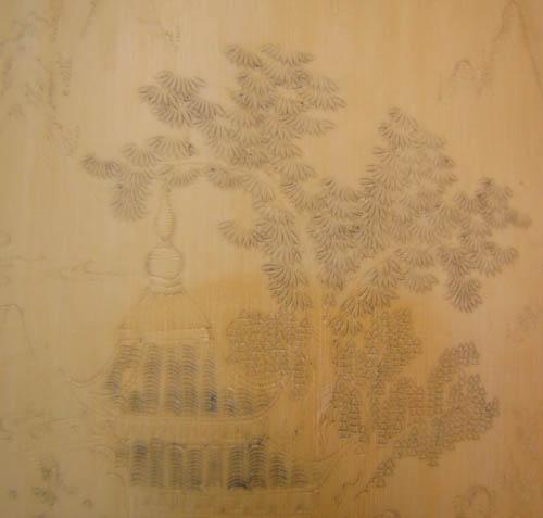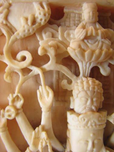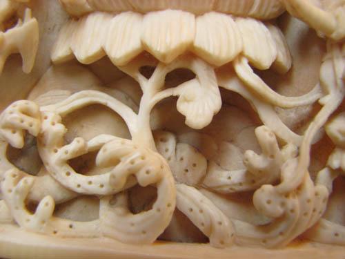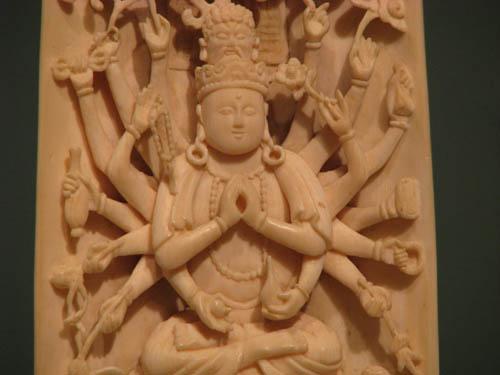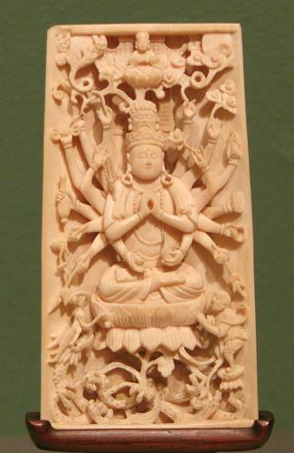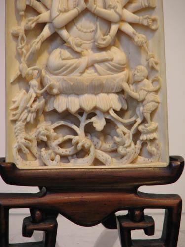 Title: Lavishly Carved Ivory Buddha Table Screen, hand carved, 18 arm Buddha with intricately carved Asian decoration. Etched Japanese Landscape on backside.