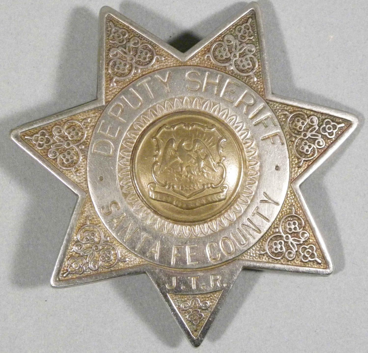 Law Enforcement Badge for Deputy Sheriff Santa Fe County New Mexico. Nickel plated brass, most nickel worn otherwise excellent condition. 3 inches.