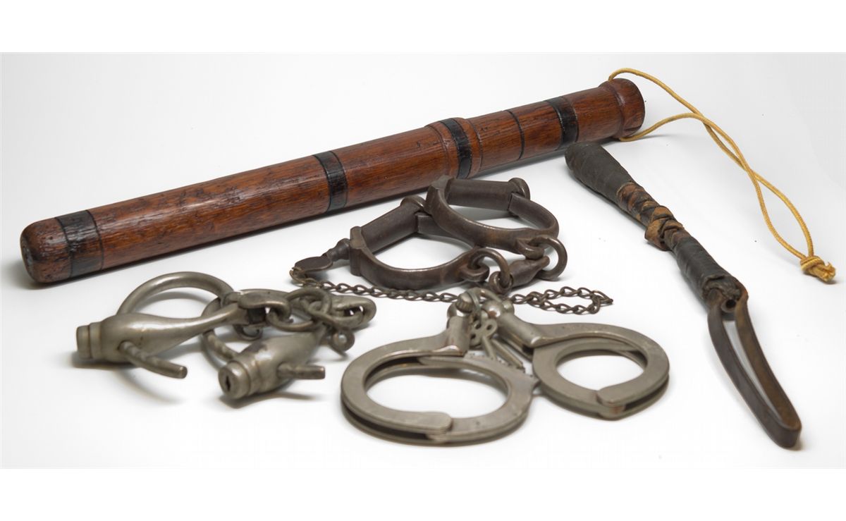 3 sets of antique handcuffs, a billy club, and a well used "blackjack." - Jacobitz Collection -59836