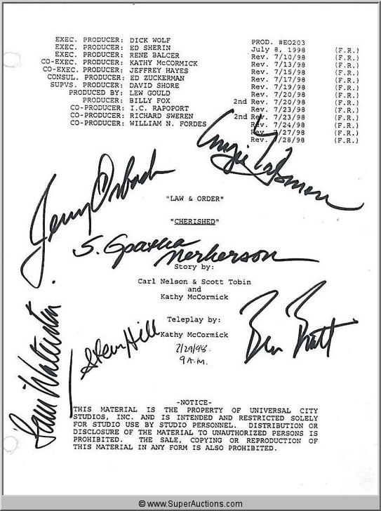 Law & Order Autographed Television Script / "Cherished" / Story By Carl Nelson, Scott Tobin and Kathy McCormick / Teleplay By: Kathy McCormick / 7/29/1998 / Production No. E0203 / Signatures Include: Jerry Orbach and Benjamin Bratt
