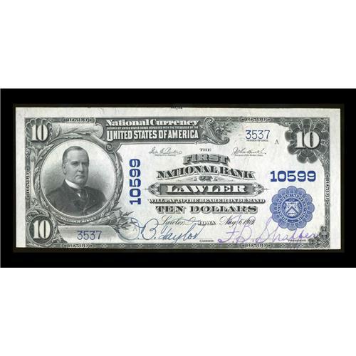 <B>Lawler, IA</B></I> - $10 1902 Plain Back Fr. 631 <B>The First NB</B></I> Ch. # 10599<BR>A very scarce bank which issued large notes only. The Kelly census shows just six examples, with this certainly among the nicest. <B>Choice Crisp Uncirculated,</B></I> with a close bottom margin offset by the lovely two color signatures this note displays.