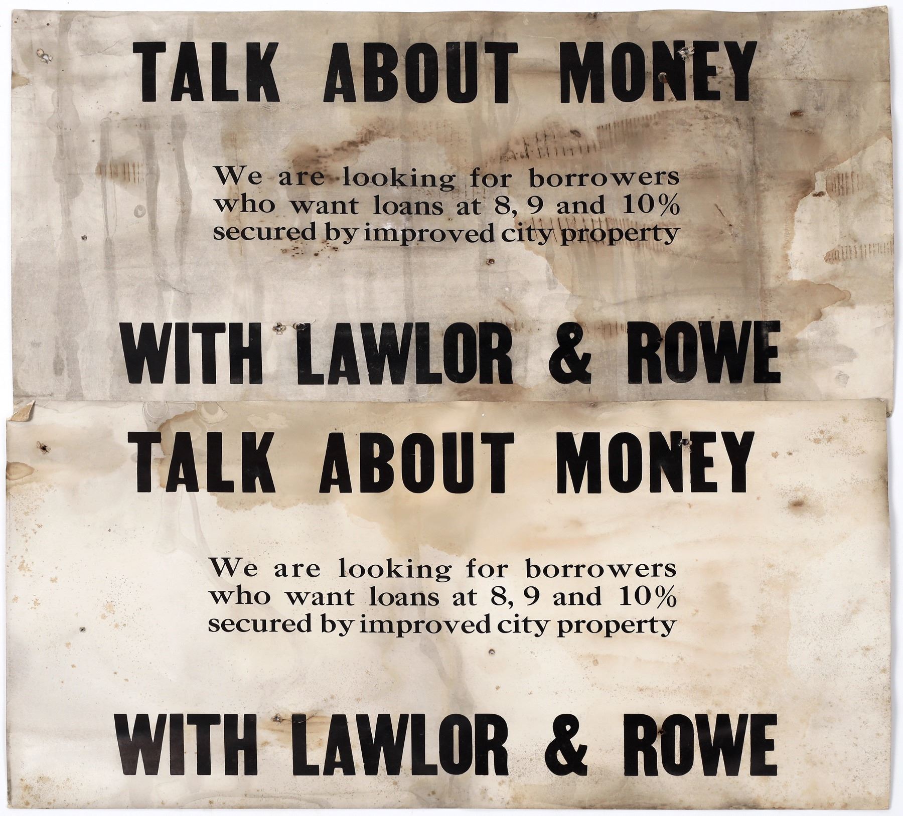 2 Talk About Money/With Lawlor & Rowe paper signs. 11x21". Stains & nail holes. Please inspect, sold as is. Stuart Mackenzie Montana Ephemera Collection