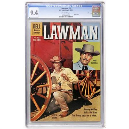 <B>Lawman #5 File Copy (Dell, 1960) CGC NM 9.4 Off-white pages.</B></I> Peter Brown and John Russell photo cover. Overstreet 2007 NM- 9.2 value = $95. CGC census 12/07: 2 in 9.4, 2 higher.<BR><BR><b>Shipping:</b> Comics - Slabbed (certified) (<a target="_blank" href="http://www.heritageauctions.com/common/shipping.php">view shipping information</a>)