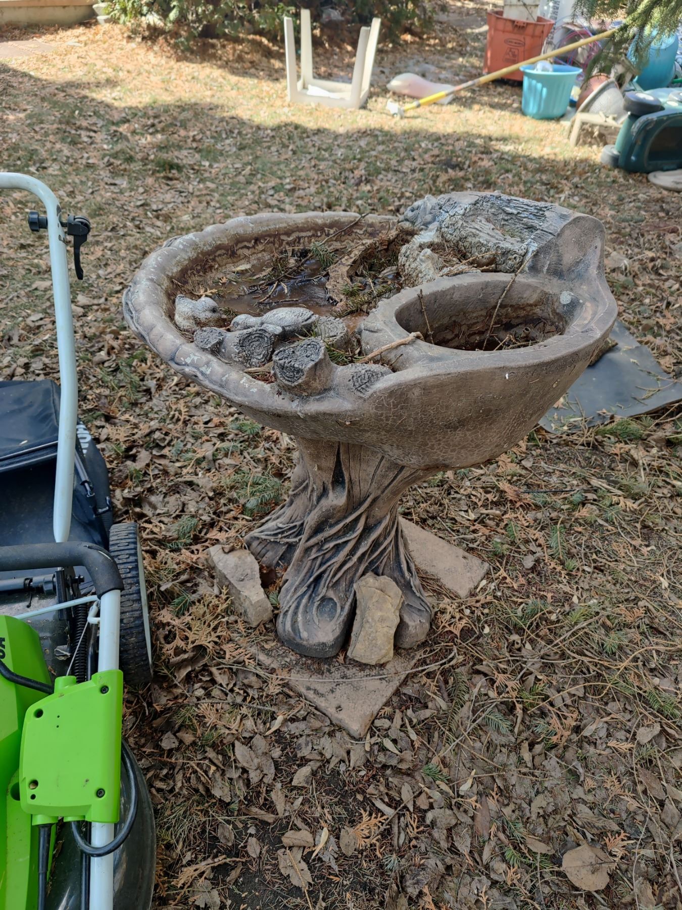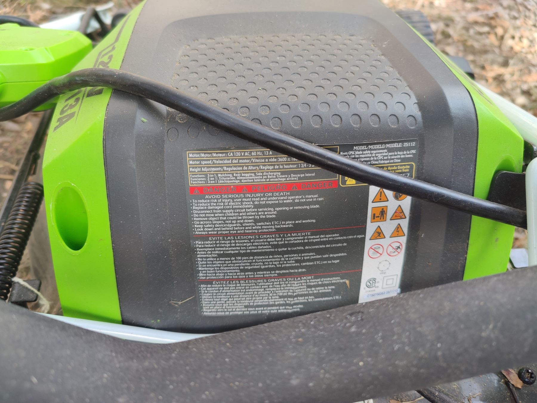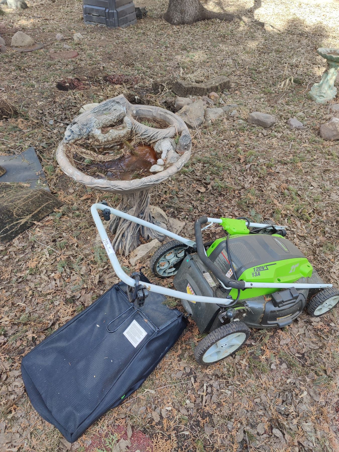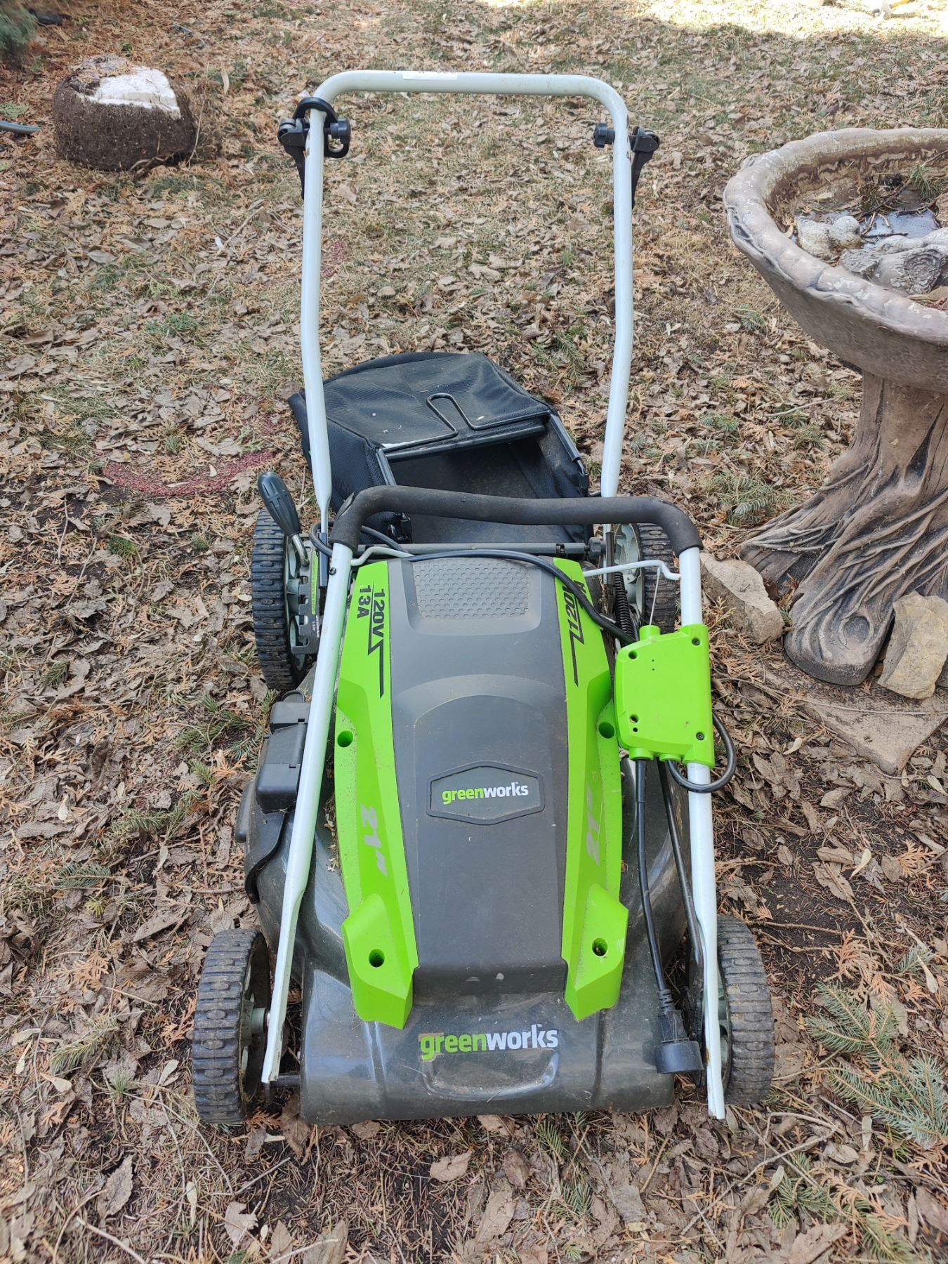 "Greenworks" brand electric lawnmower, with bird bath. Mo.#25112. Untested.