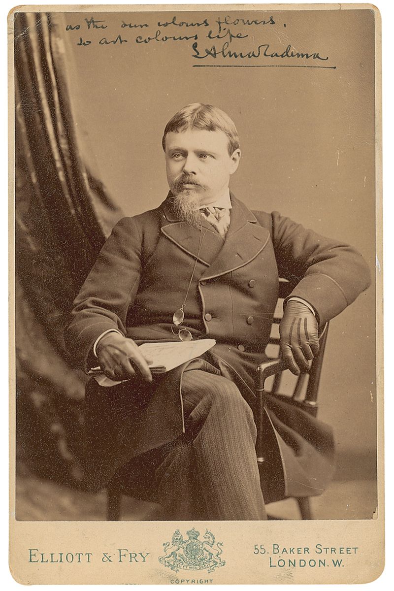 Dutch painter (1836–1912). Original 4.25 x 6.5 cabinet photo of Alma-Tadema seated in a chair with a pad in his lap, by Elliott and Fry of London, signed at the top of the image in black ink, “As the sun colours flowers, so art colours life. L. Alma-Tadema.” In very good condition, with light wrinkling and creasing to top corners, a bit lightly affecting end of signature, some light soiling to bottom border, and ink and pencil notations on reverse.
