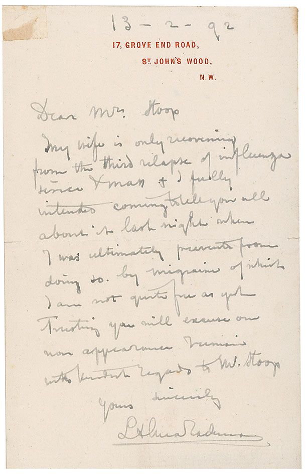 Dutch painter (1836–1912). ALS signed “L. Alma-Tadema,” one page, 3.75 x 6, personal letterhead, February 13, 1892. Alma-Tadema apologizes for missing a meeting. In part: “My wife is only recovering from the third relapse of influenza since Xmas & I fully intended coming to tell you all about it last night when I was ultimately prevented from doing so by migraine of which I am not quite free of as yet.” Central horizontal and vertical fold, with vertical fold through a single letter of signature, uniform shade of toning, and mounting remnant to top left, otherwise fine condition.