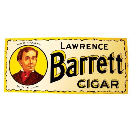Lawrence Barrett Cigar Porcelain Sign. Burdick Consumers Building, Beaver Falls, PA. Four small chips around the edge otherwise excellent condition. 40 X 18 inches.